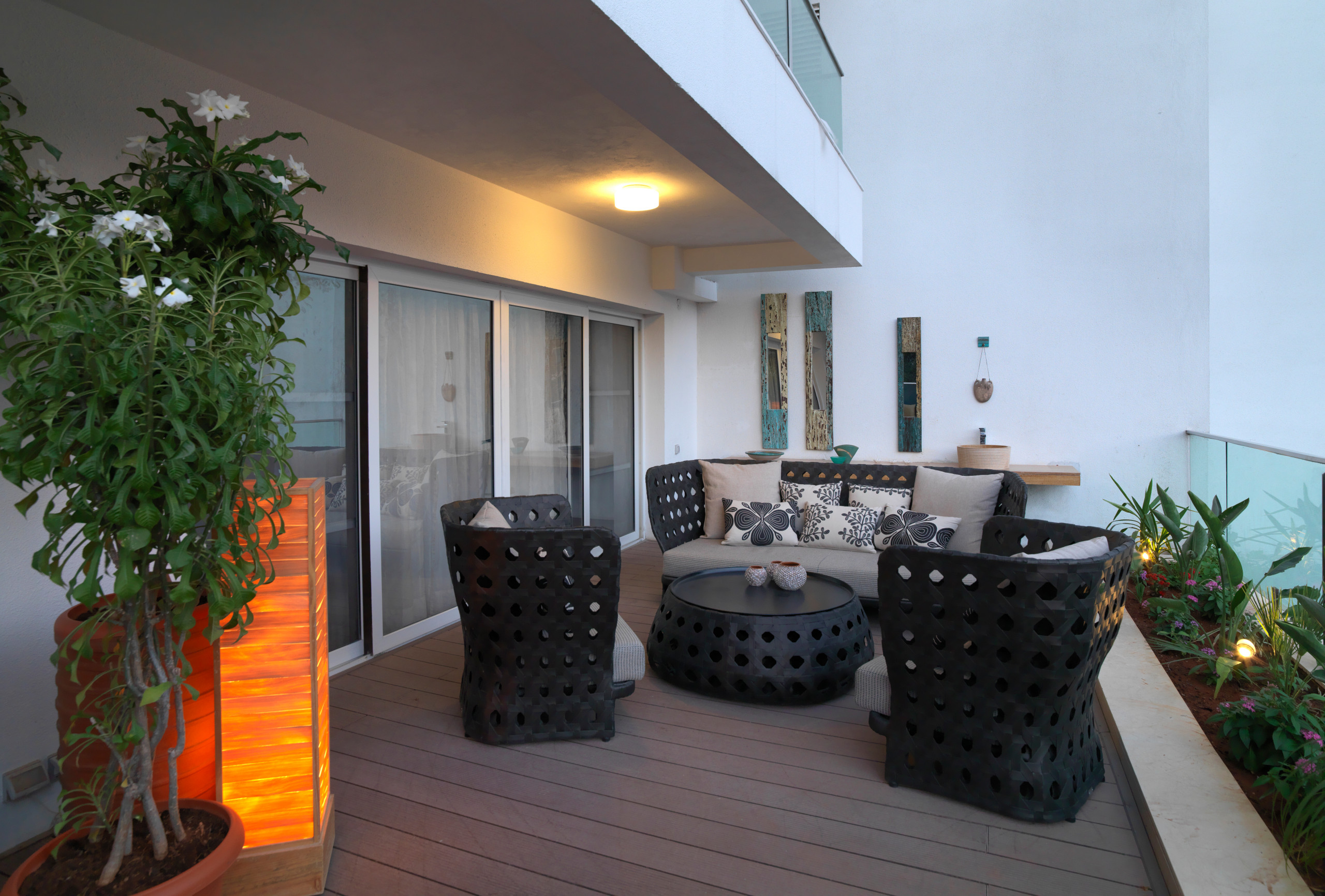 Considering the tropical Indian weather, resilient and comfortable wicker furniture is a sensible choice for outdoor areas like terraces. Here, Fadd Studio sets up a relaxed lounge area using wicker sofas, chairs and a coffee table. Beige cushions and mattresses offset the black furniture and also ensure comfort, an essential for lounging zones.