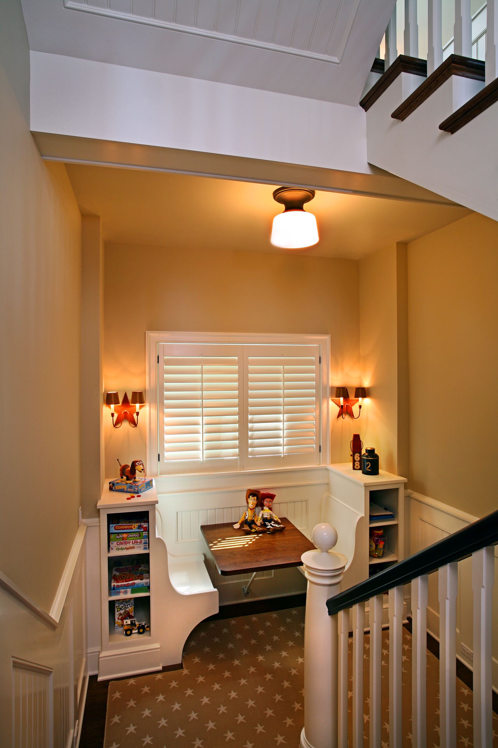 9. The landing on the stairs has been converted into a cozy niche cum study area for the kids. There’s a brown collapsible desk that can be opened when required. The fixed white benches have attached rectangular shelves behind them to store books, stationery and things.