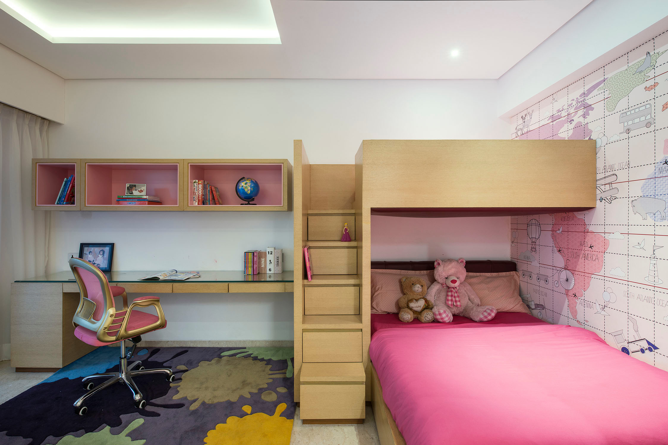 5. Pink flows through different spaces in this girl’s room, including the study area. The study table is an extension of the bunk bed and features a chair with pink upholstery, and beige-and-pink shelves. One can store notes under the transparent glass top to prevent fly-aways and yet keep them in view. Stationery can be arranged in the drawers, while the stair steps, with hidden storage, make room for so much more other stuff.