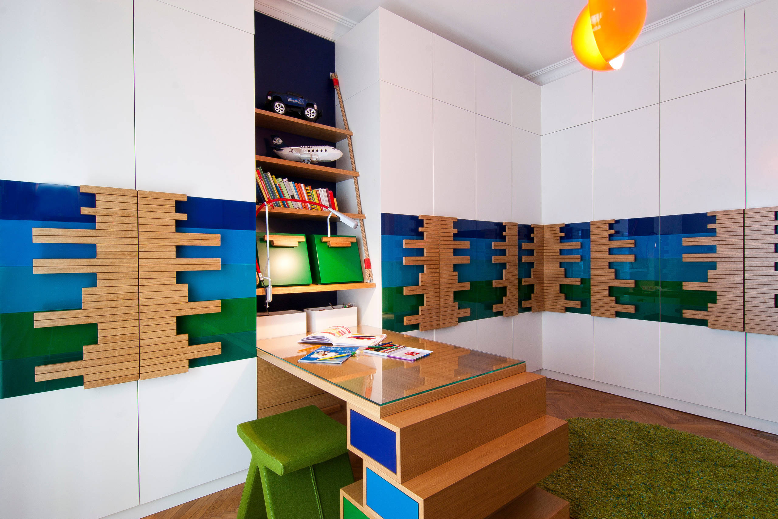 7. In this space, the designer goes for a sleek, wall-mounted table that is spacious enough to seat two. The kids share a blackboard and a shelf at the top, though they do get their own exclusive, tiny open cabinets on each side. The best part of this space for the kids, I am sure (and definitely for me), are these unique chairs with removable seats of adjustable height.