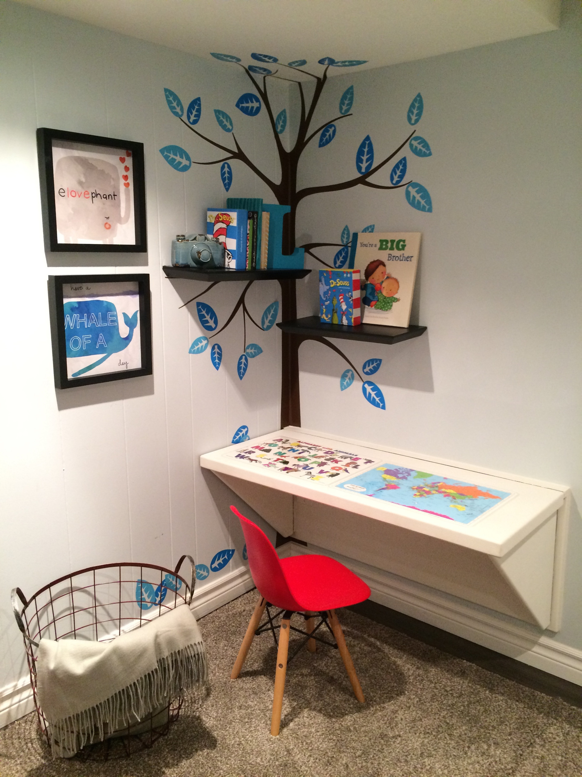 6. Inspired by nature, this tree-themed desk is fun and practical too. The tree mural with colourful blue leaves features branch-shelves to stack books and is complemented by a vibrant red chair. Another creative touch is added by using map and alphabet stick-ons to cover the top of the floating desk instead of leaving it bare.