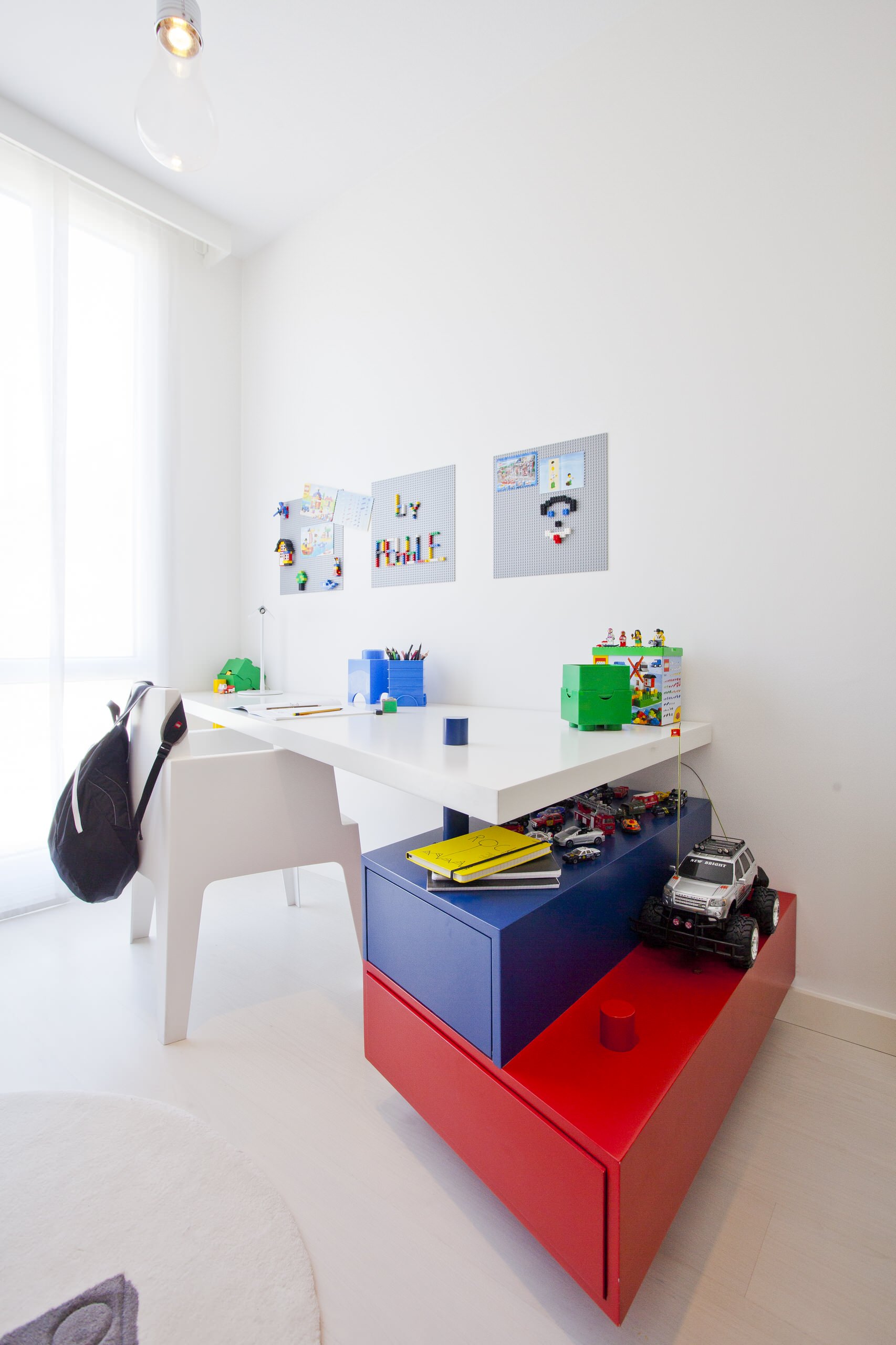 8. This sleek white table and chair combo is perfect for an older child. I am certain that Its strong style and contemporary design will fit right in with most hard-to-please teenagers. A pop of colour is introduced with the contrasting red-and-blue block drawers for school essentials. They also double as shelves for books and accessories that need to be kept in view.