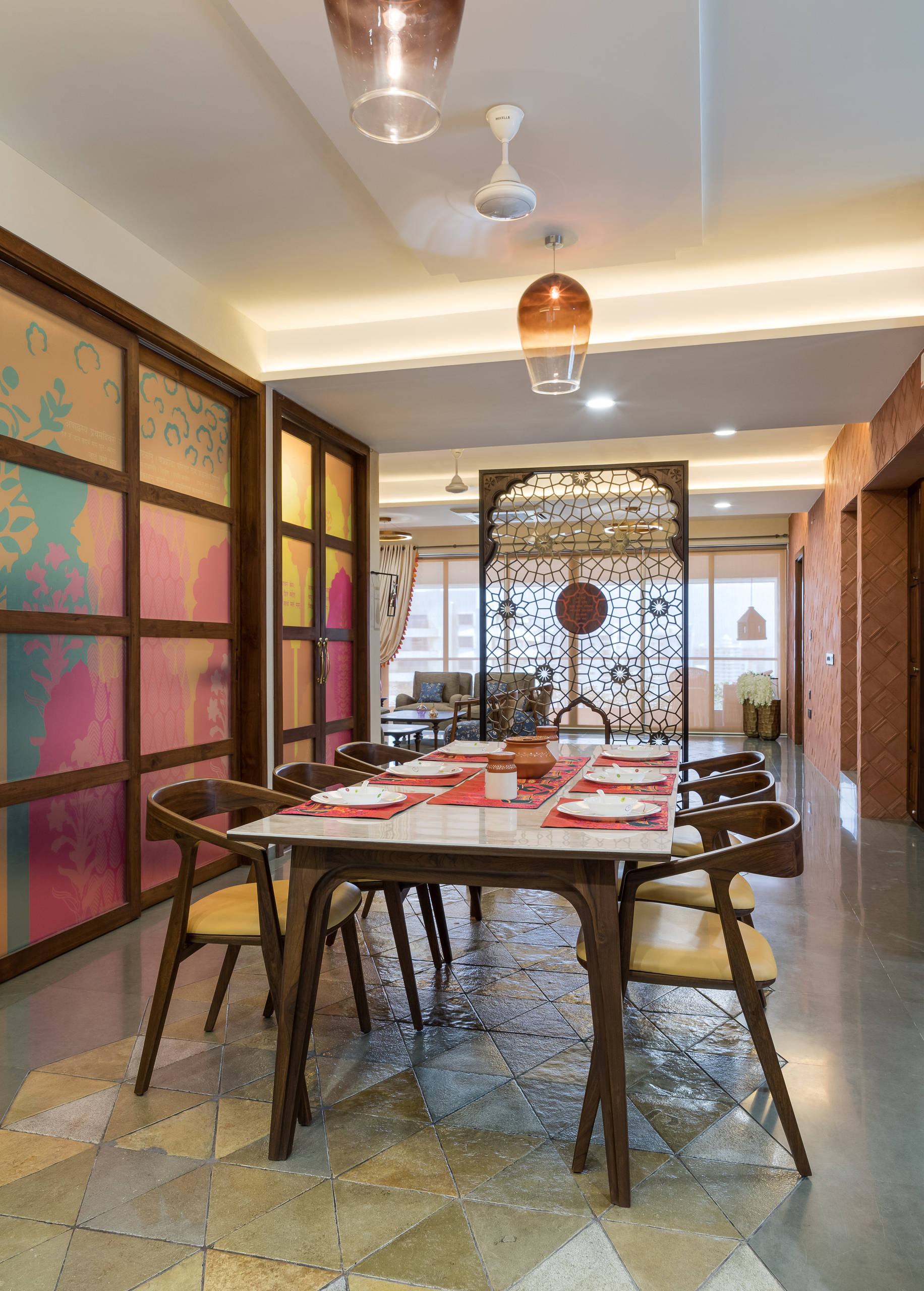 2. In this dining area, the wood-framed, multi-hued sliding door looks almost like a wallpaper, enhancing the vibrant ambience. When pulled back, it reveals the TV room hidden behind it.