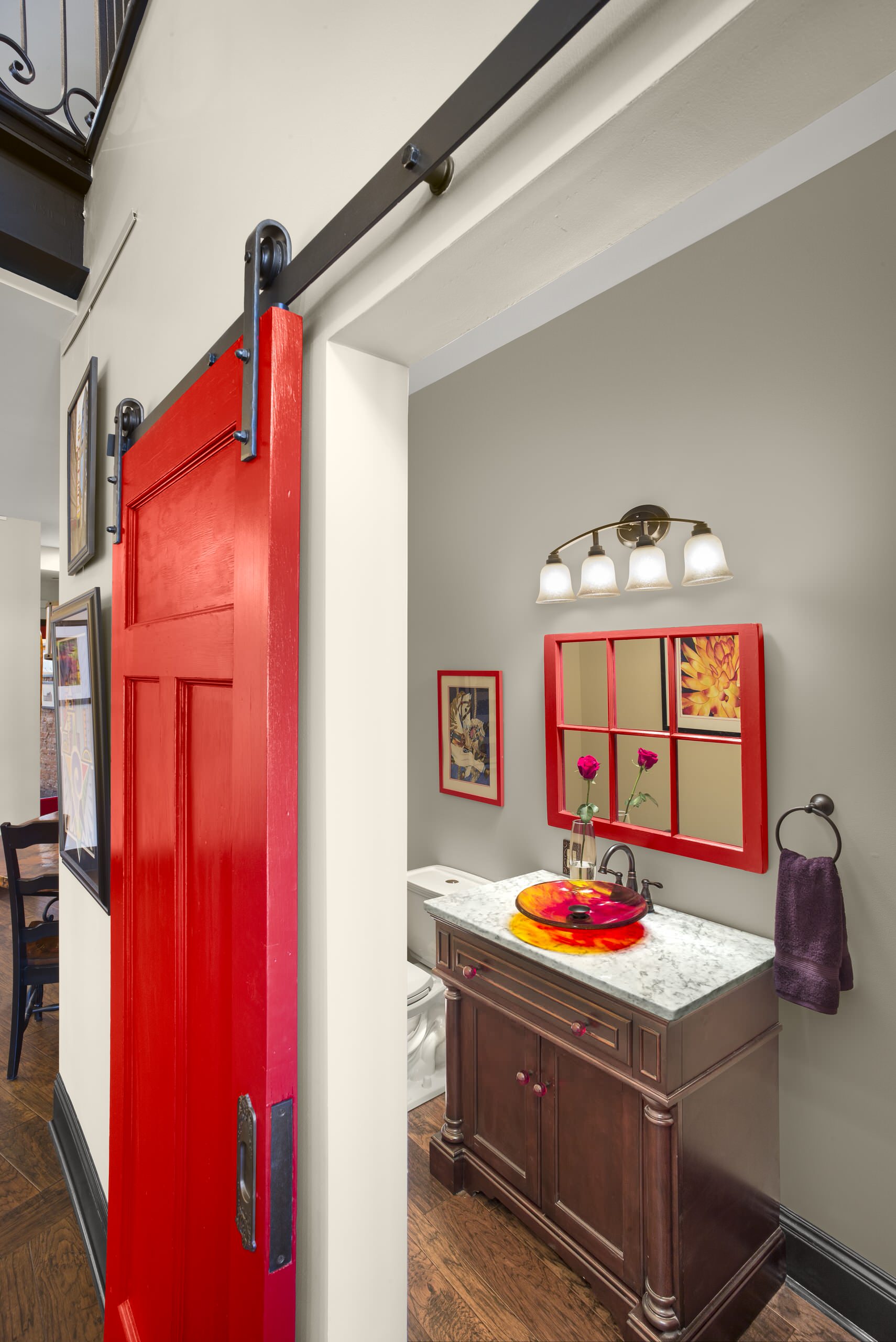10. The industrial look of this sliding door is quite intriguing – its wood-and-metal design goes well with the bare brick walls of the bathroom.