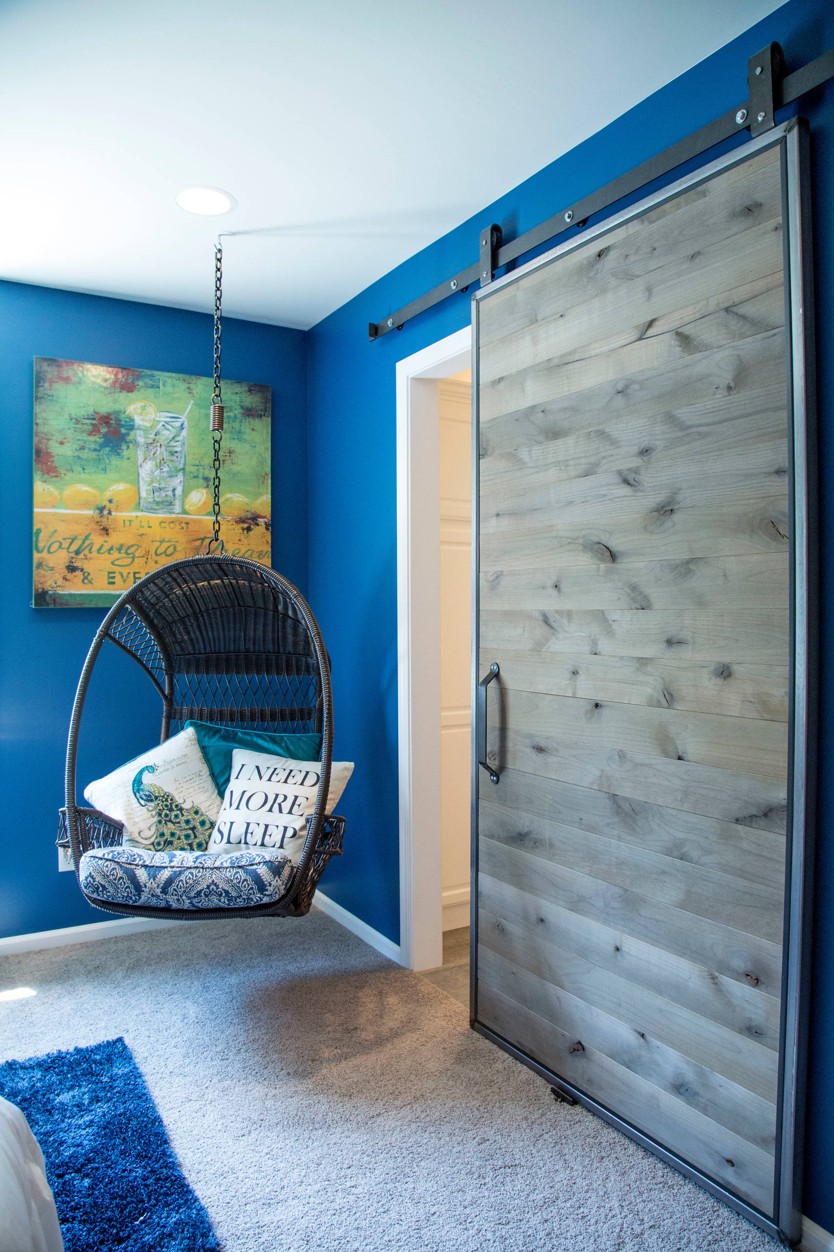 7. A modern, vibrantly blue room gets a rustic outdoorsy vibe through the wooden sliding door. The contrast is quite eye-catching.