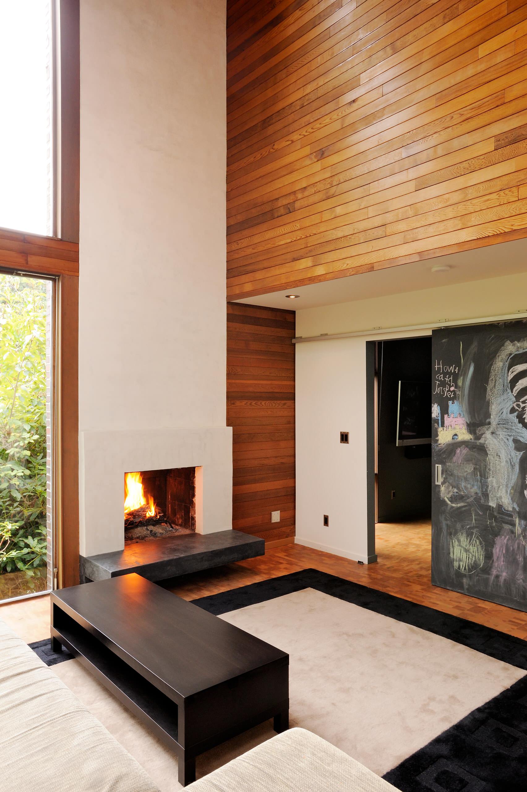 1. This herringbone-patterned sliding door made of veneer and bison board connects the TV room to the dining room, while adding a rich dose of design to the two spaces.