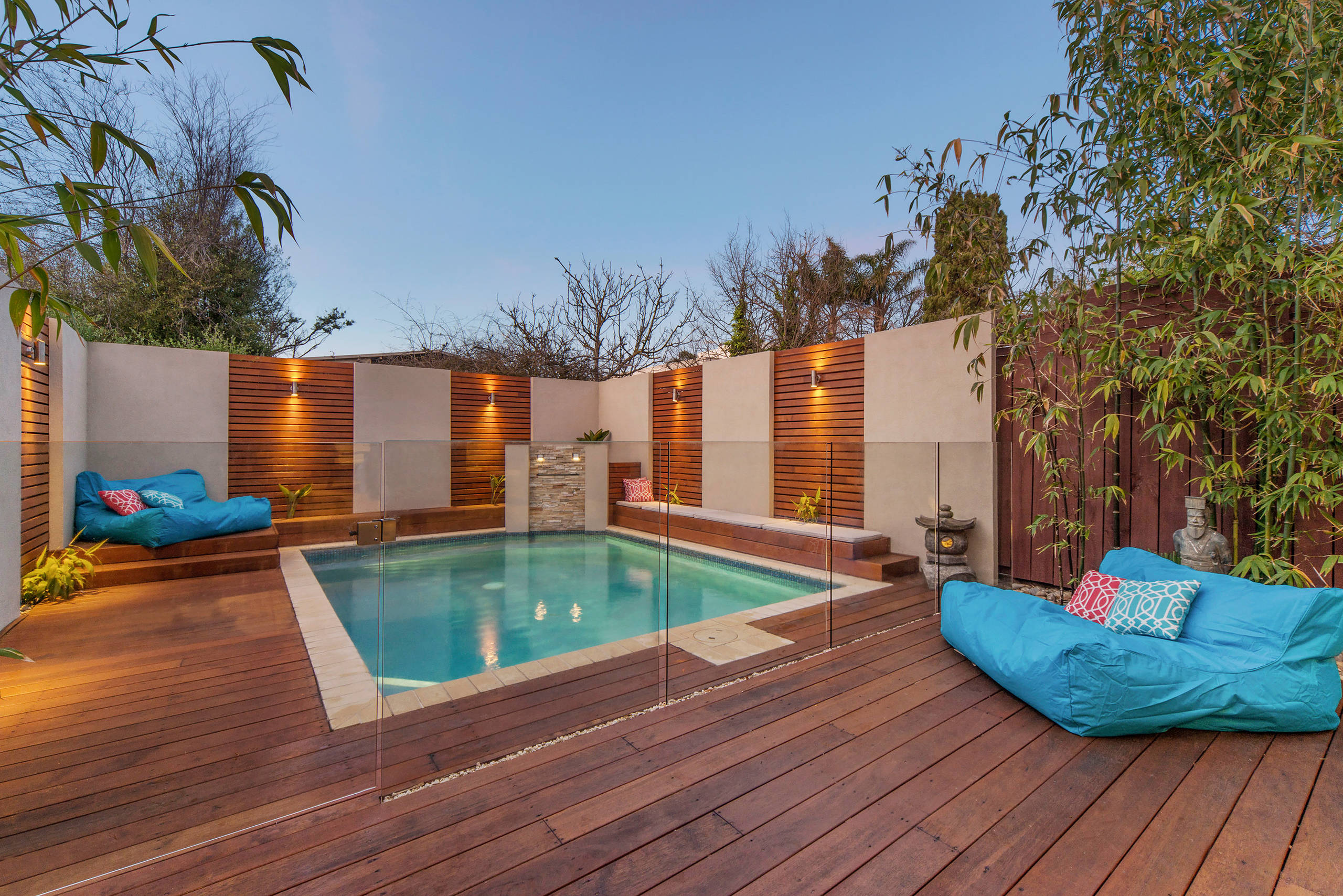 9. In this picture, frameless glass balustrades with gates keep the pool area off-limits when required. It also helps the other side of the deck stay splash-free, so one can watch without being in the middle of the action. These glass panels are embedded beneath the surface for durability and don’t interfere with the textural beauty of the wooden planks.