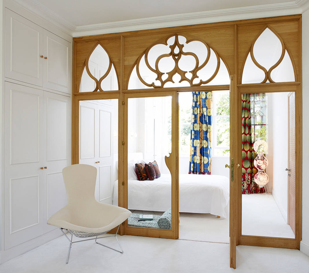 4. Blending the modern with the classic, this eye-catching glass partition separates the walk-in wardrobe (in the foreground) from the bedroom. The carved wooden frames help enhance the segregated bedroom nook, providing an almost cocoon-like feel to it.