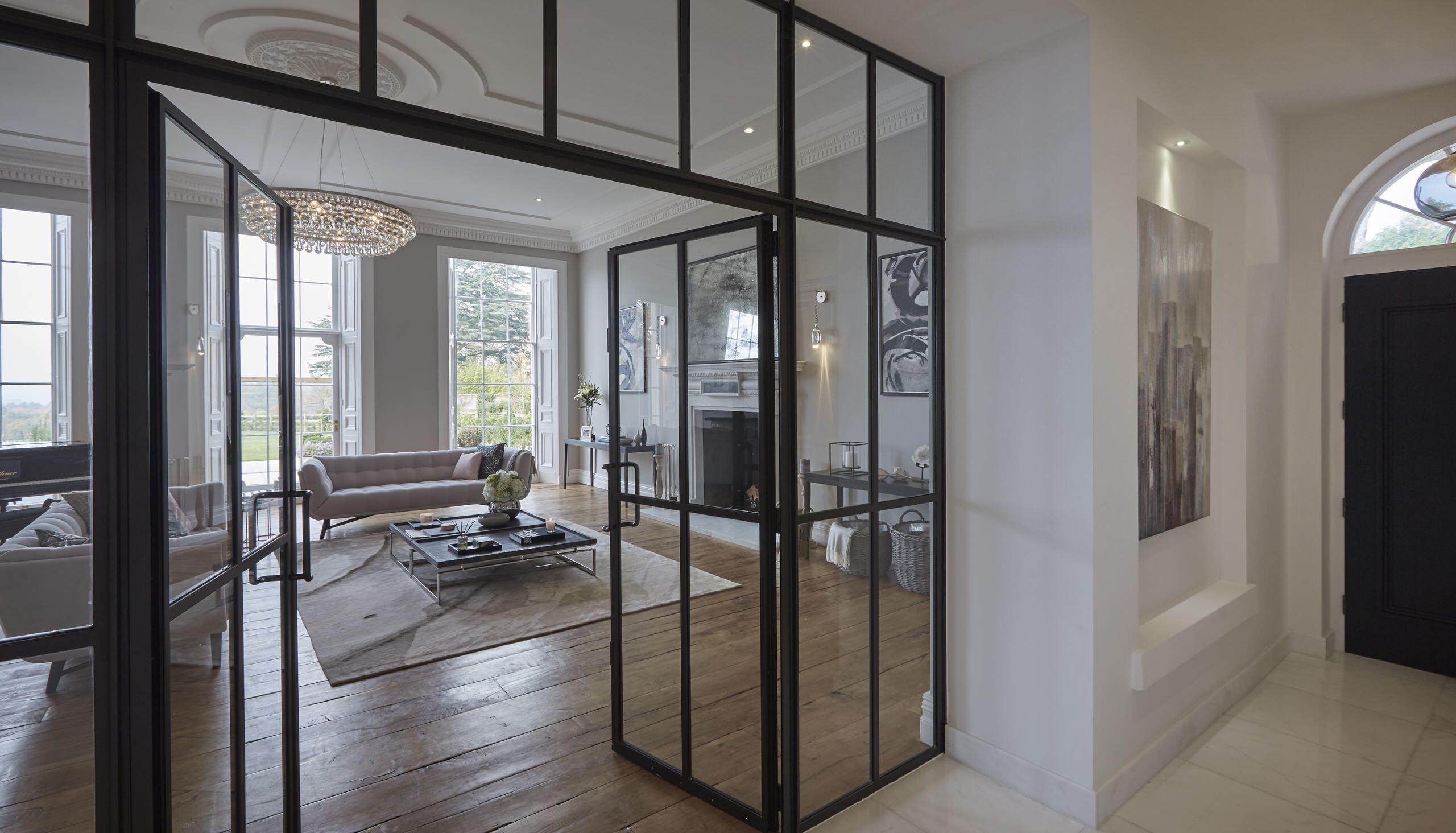 7. This home lacked natural light in the hallway, despite having large windows. Black-framed glass screens replaced the walls between the hall and living area to bring light into the dark spots. The steel-and-glass partitions bring a Georgian feel to the space.