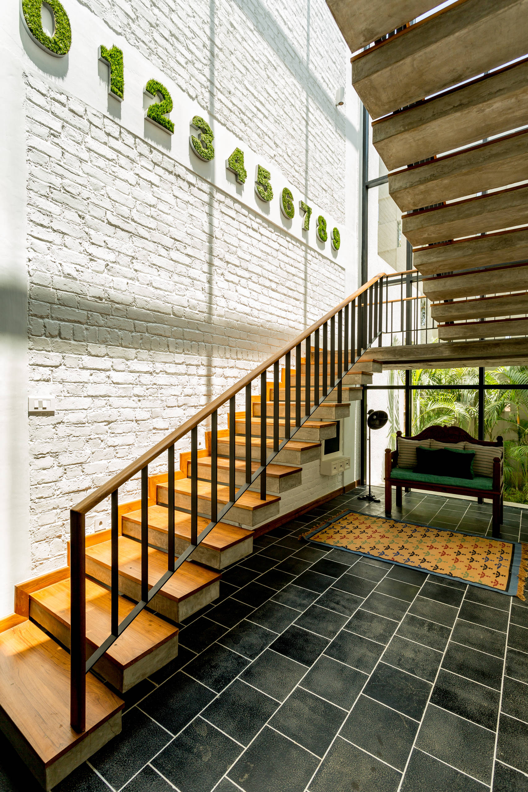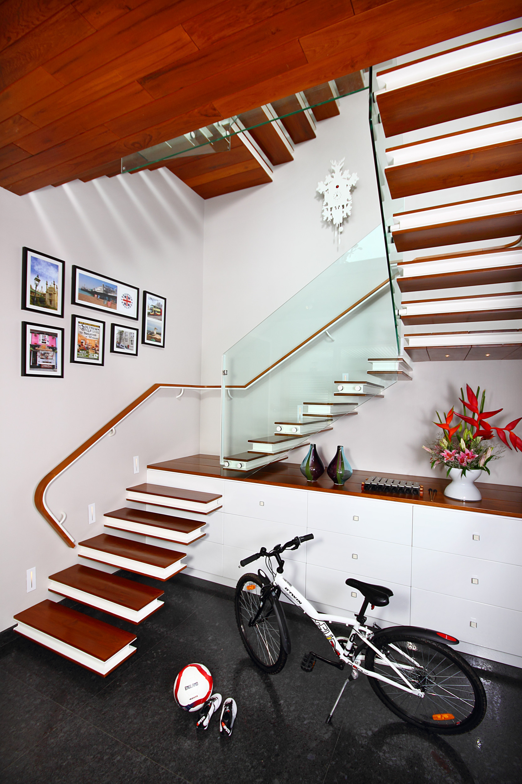 The space below and beside the staircase is large enough to accommodate many functions – in this case, prayer time, as is apparent by the presence of an idol and the puja accompaniments kept in front of it.