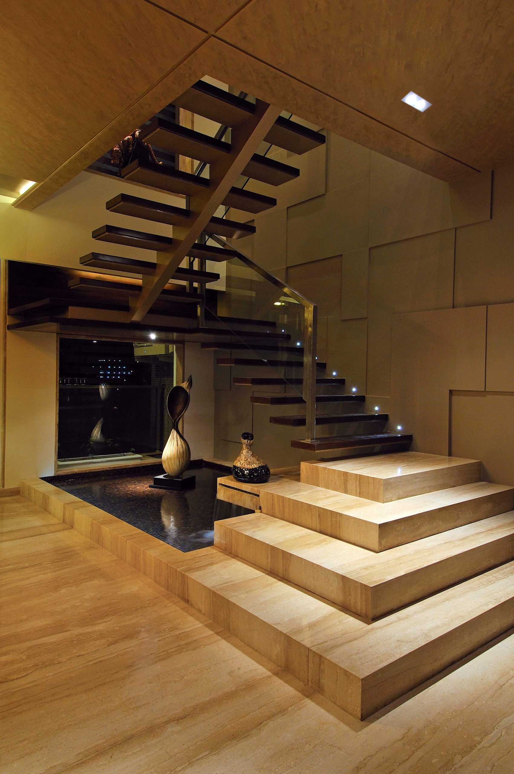 Just watching calm, still water can induce a feeling of relaxation and help cool down the temperature of a place. Which is why the ample area under the staircase here has been utilised to accommodate a small water body with graceful sculptures.