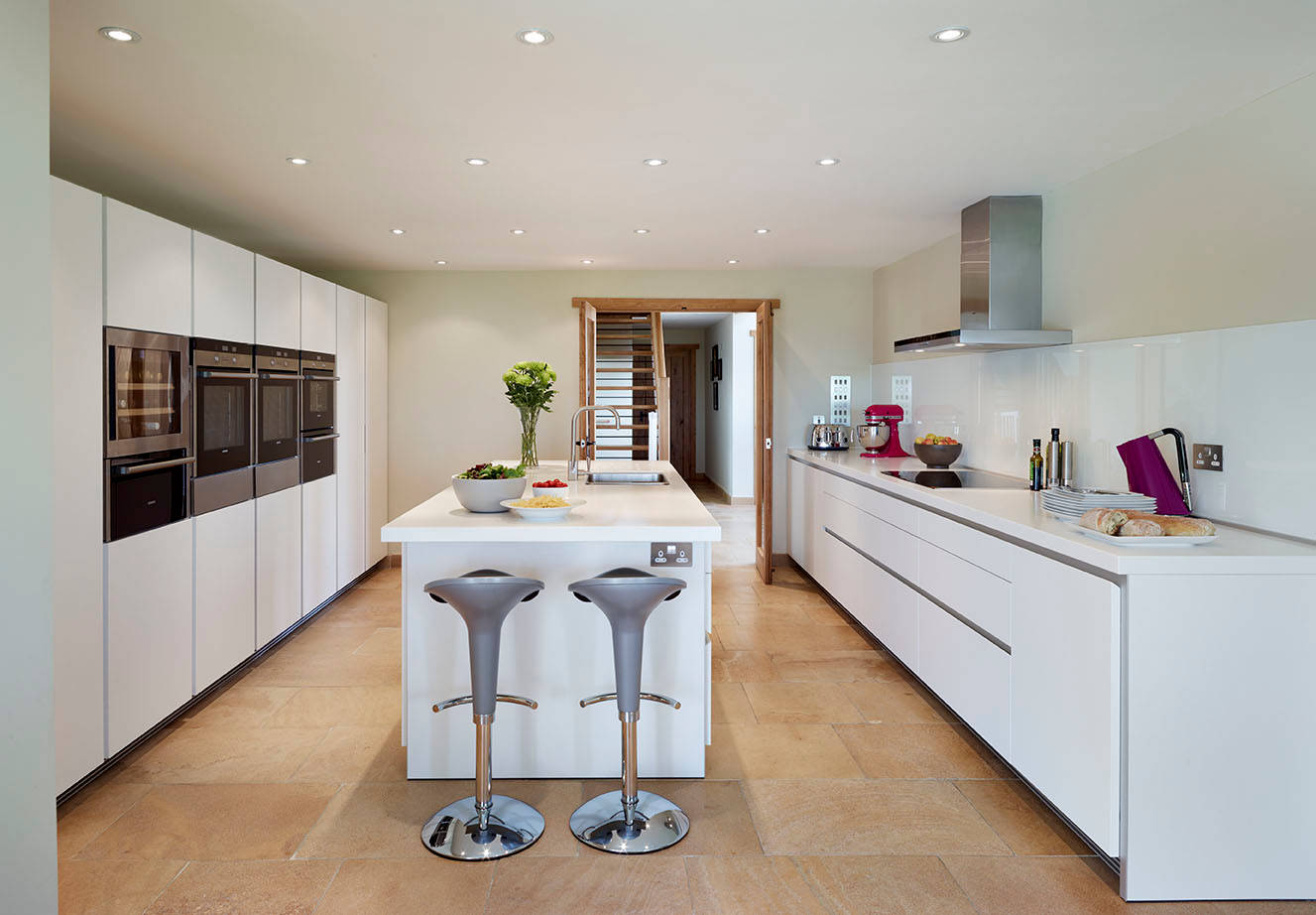 If you have plenty of space, why not create a horizontal run of similar-sized appliances? This sleek block of ovens with various functions looks smart and each one is at an ideal access height.