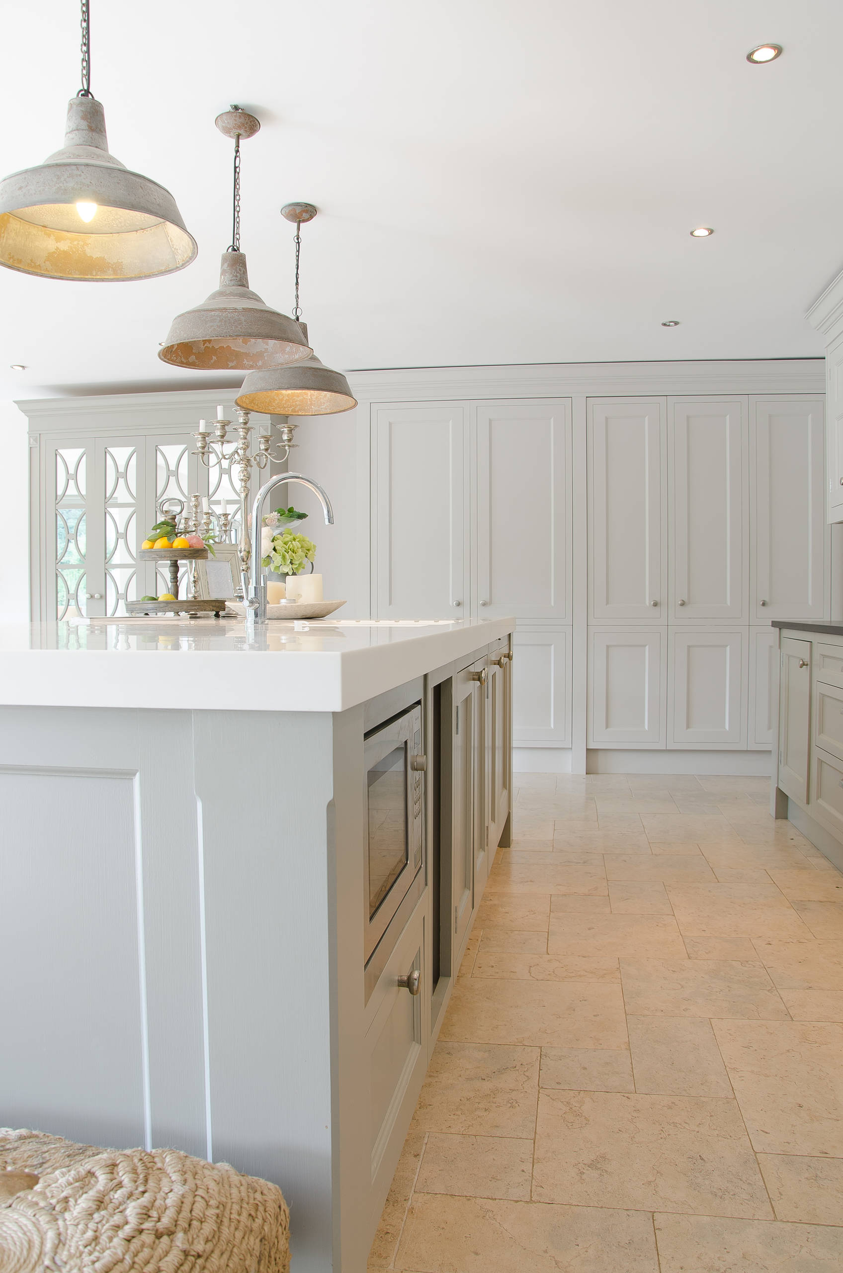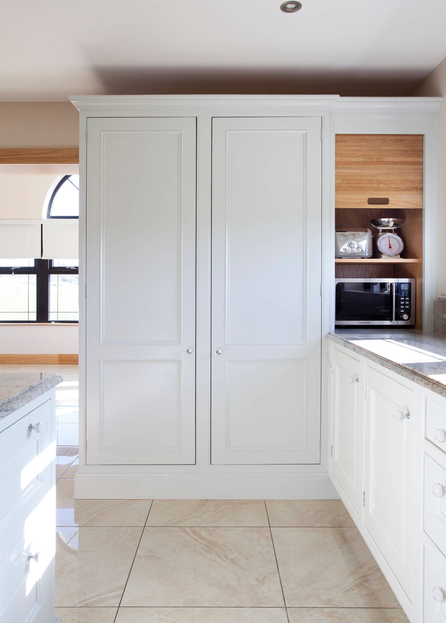If you really don’t use the microwave that often and are lucky enough to have a utility area, move it there. This airy utility room has space in a wall cupboard for an integrated machine, but it could just as easily be a freestanding version sitting on the worktop.