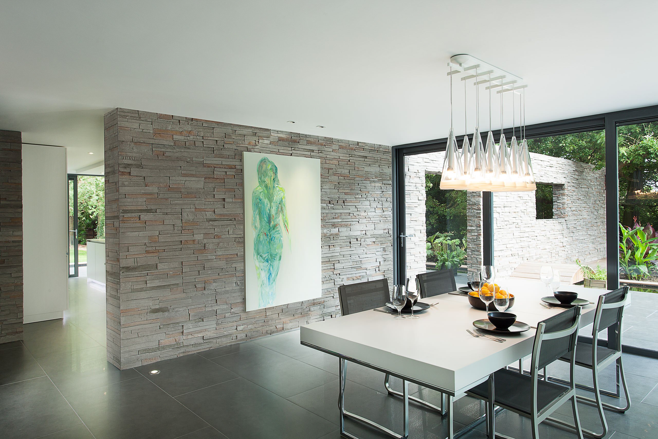If you prefer a more old-school approach to 3D surfaces, then a wall of slim stone tiles might work for you. This look is a cool update of the brick-clad 1970s trend. Here, the wall not only warms up what might be a rather cold space, it also visually links with the garden wall outside. Try mini oyster slate tiles for a similar look.