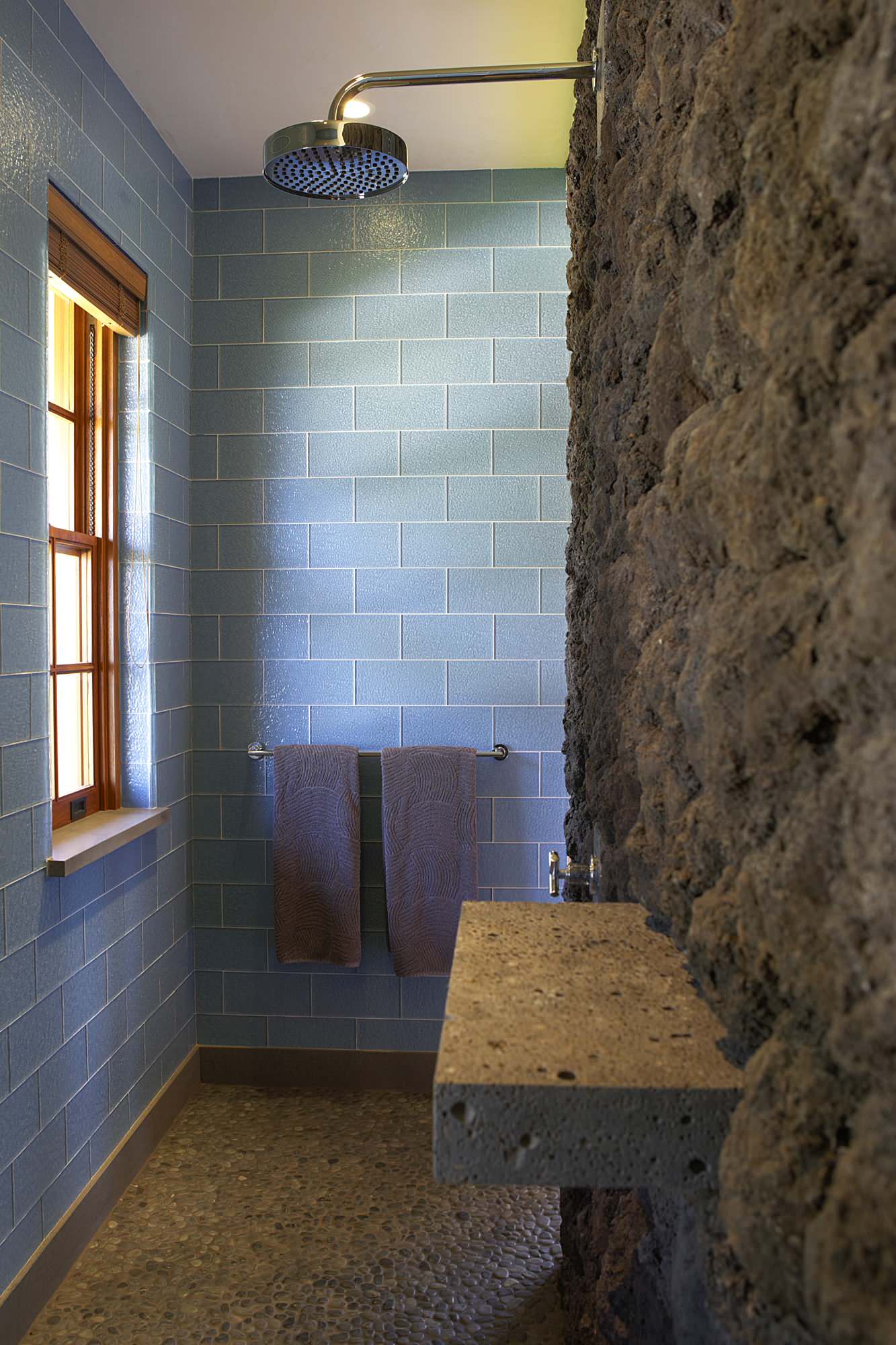 A gleaming blue wall created from sleek blue tiles is framed by a wall made of raw rock, suggesting a limpid pool hidden on the slopes of a rocky volcanic island. The stone floor takes on the role of the pool bottom. A shower here would be like going under a waterfall – it’s the next-best thing to a trip to Hawaii, I’d say.