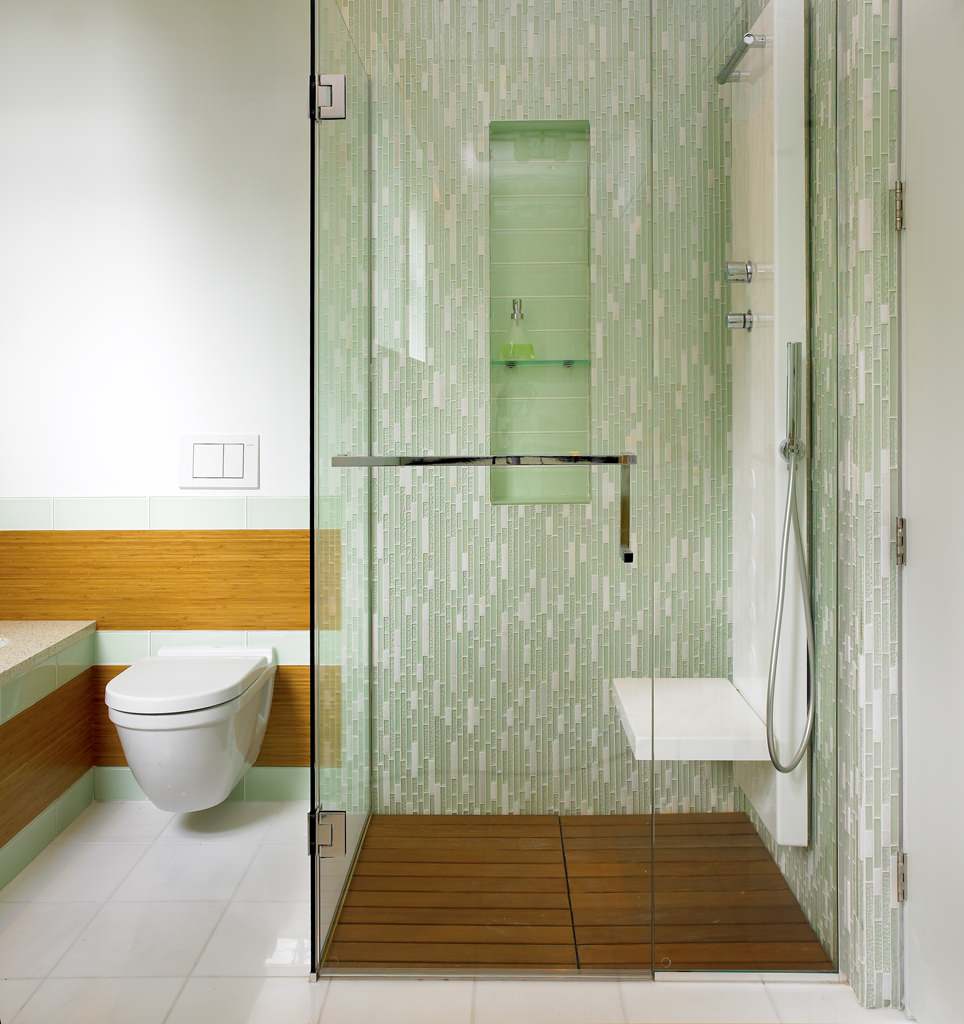 Tip: Small glass tiles can be used to create distinctive decorative partitions in your bathroom.