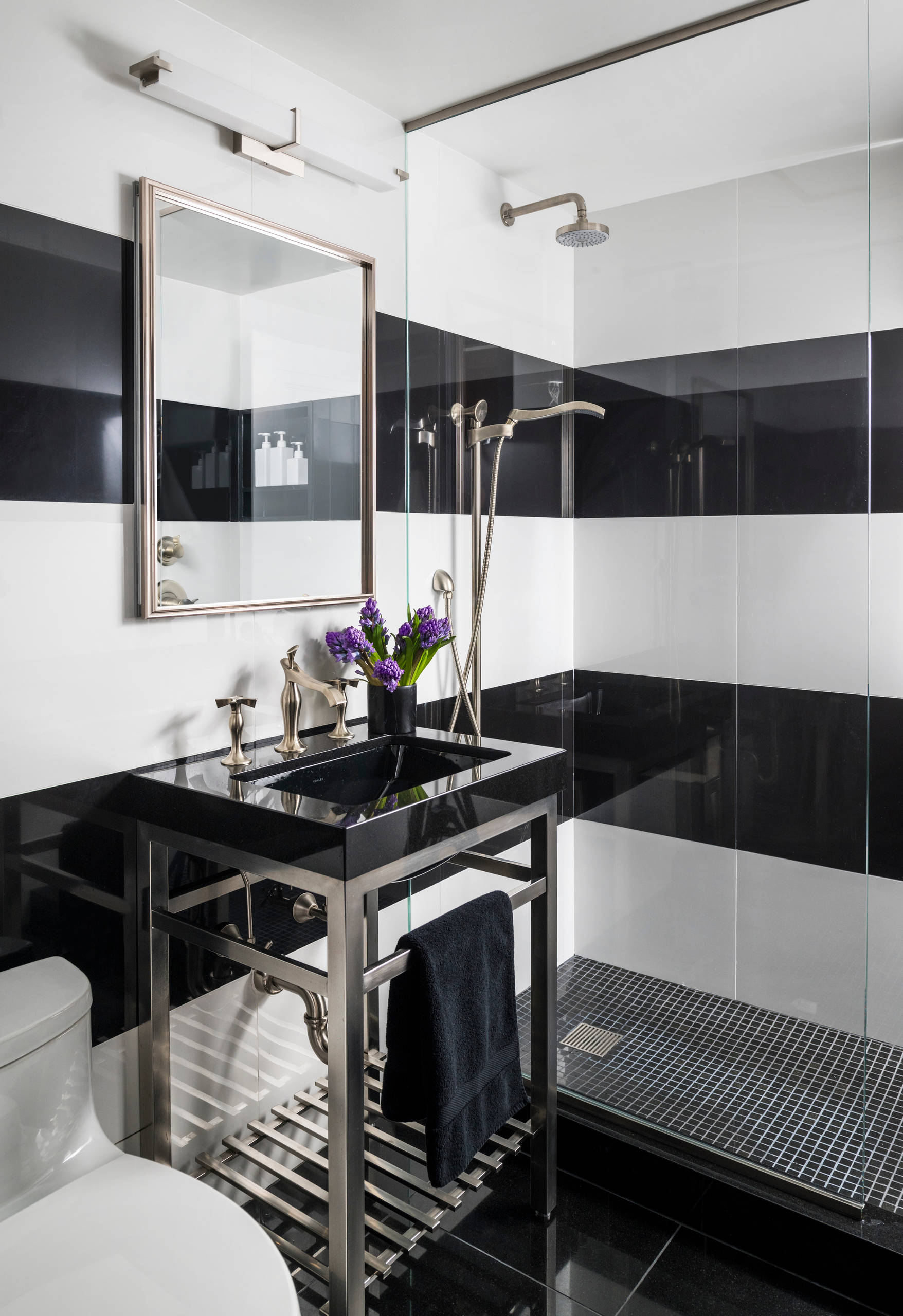 The black and white bathroom by Evelyn James Interiors incorporates a clean-lined bathroom decor. A pattern is created with solid-colour wall tiles and matching floor tiles.