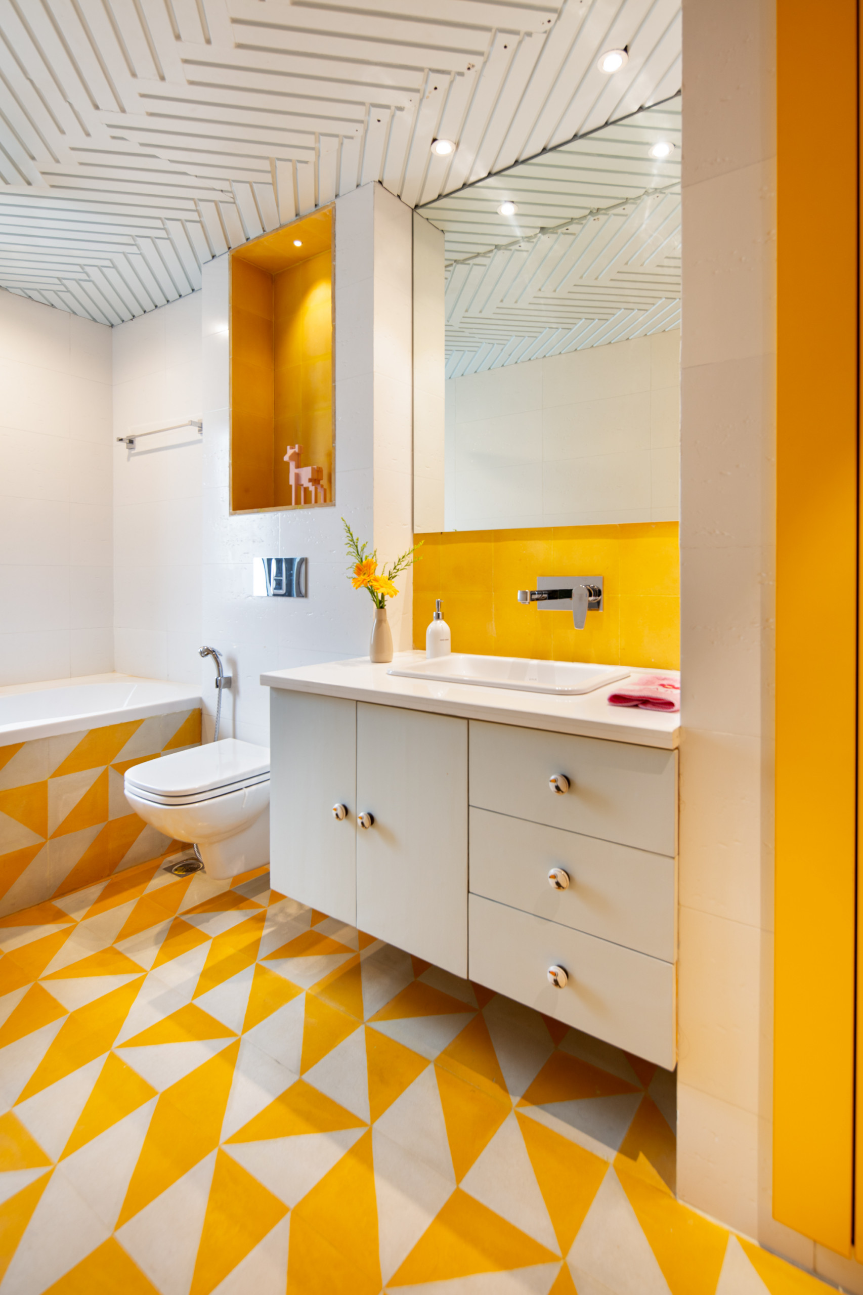Mold Design Studio has infused a sunny vibe into the bathroom decor with yellow and white patterned floor tiles. The walls incorporate white tiles and yellow tiles for the niche and backsplash.