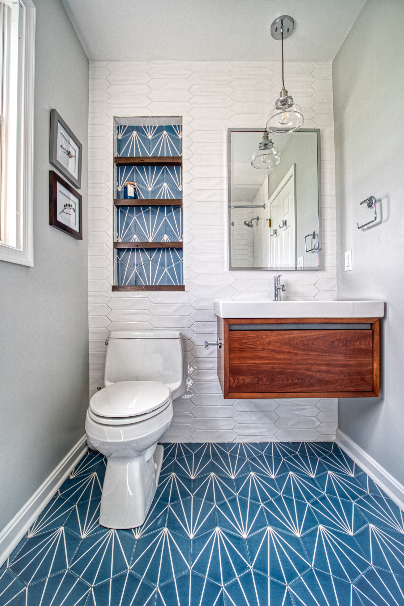 Patterned tiles stand out against a white base, like in this bathroom by Bearded Builders, Baltimore.