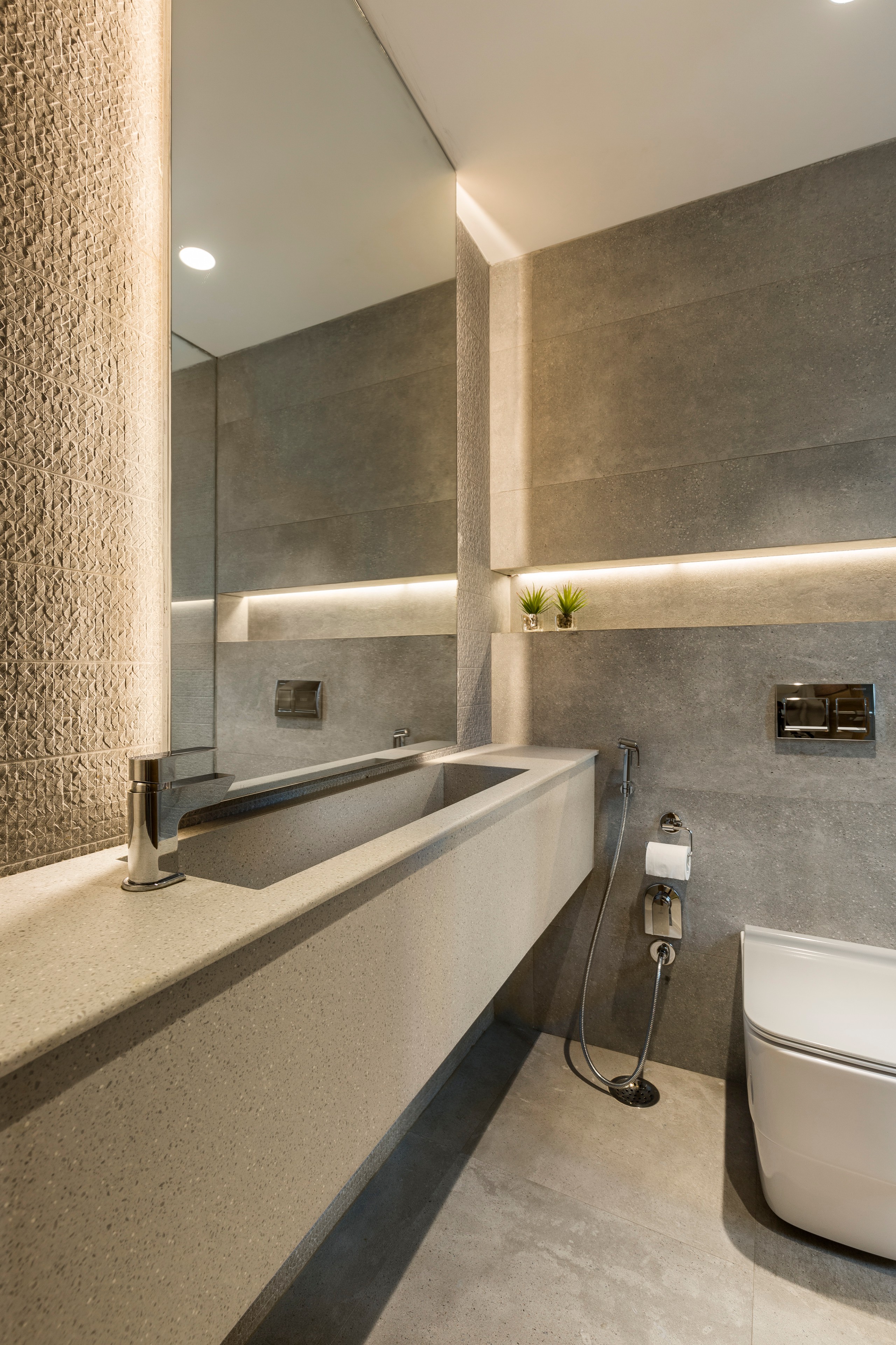Studio Wood has highlighted the textured tiles of the backsplash and the niche with diffused illumination. Contrasting matte-finish base tiles adorn the rest of the bathroom.