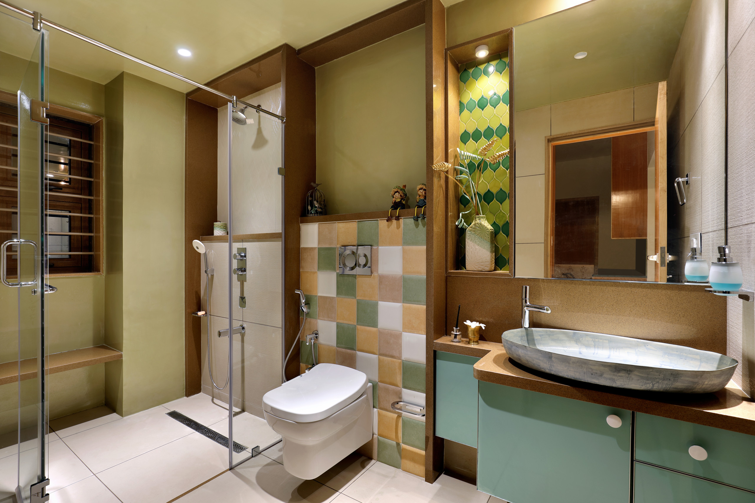 In this bathroom by Pranav Patel Design Studio, the space is visually divided into multiple sections. One set of highlighter tiles has been used for the niche and a different set of highlighter tiles for the wall of the concealed flush behind the water closet. The rest of the bathroom features extensive use of wood and different colours for the walls and cabinetry.