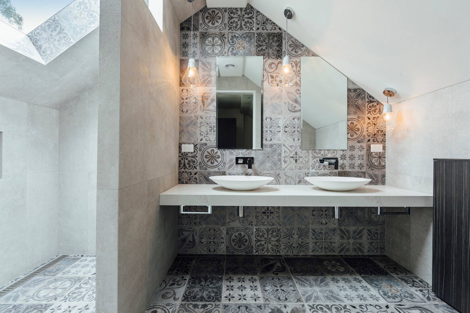 Spice up the decor of bathrooms by mixing and matching patterned, coloured and textured tiles