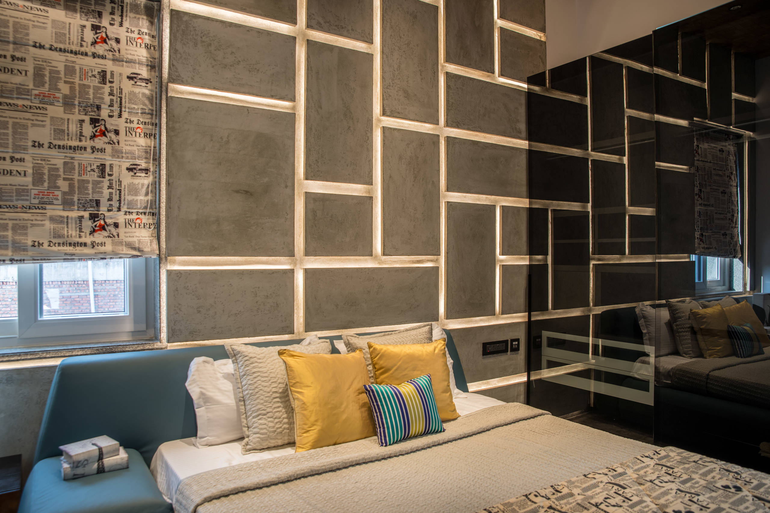9. The concrete slabs framed by recessed LED lights make an elegant accent wall in this bedroom. The illumination by light emerging from behind the slabs bathes the room in a gentle radiance and gives a layered depth to the wall.