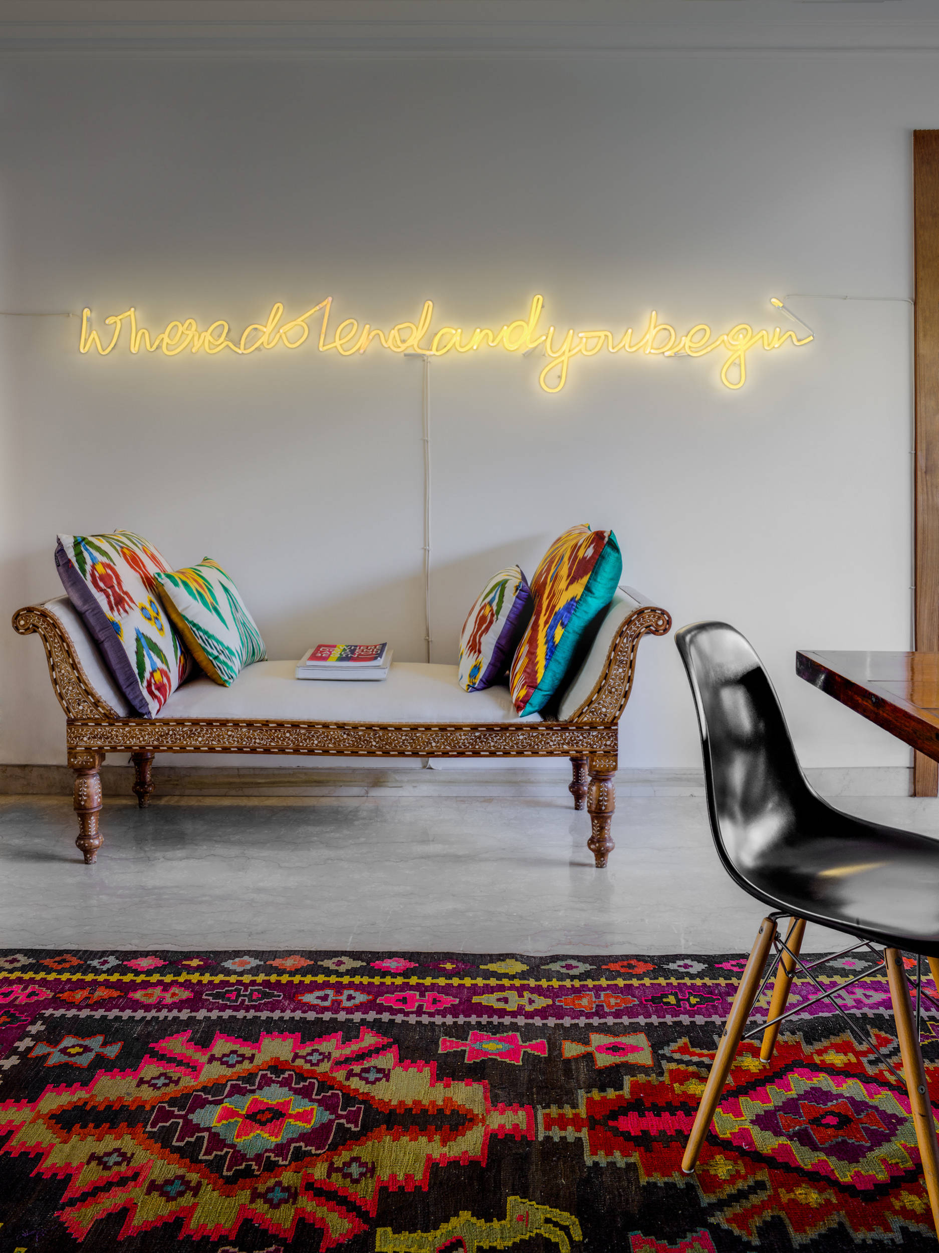 6. The neon sign on this wall makes a statement in this interior space, literally and figuratively. The striking quote is the only decoration on the wall and it injects a quirky element in a decor characterised by colourful patterns.