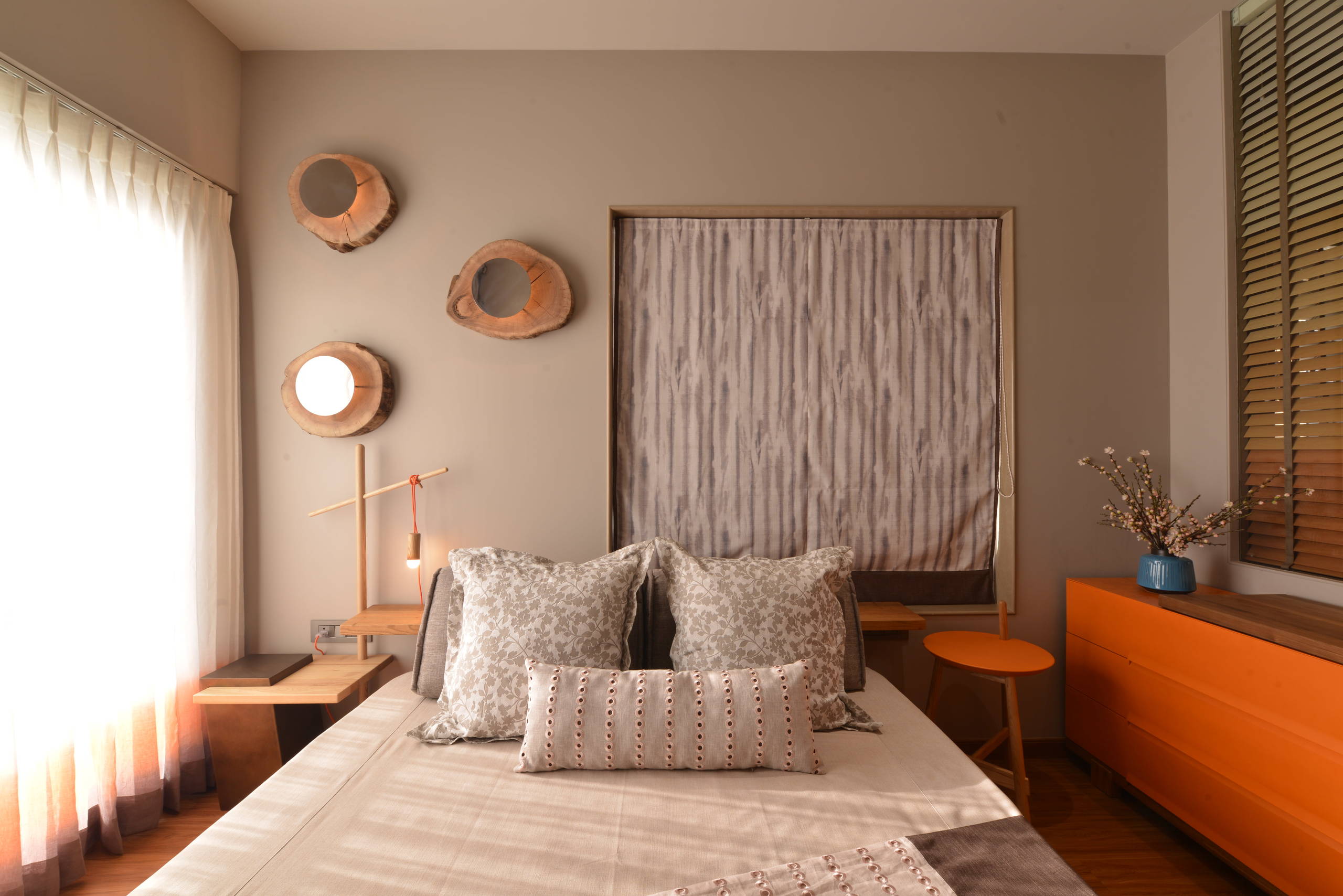 4. Slices of tree trunks are the bases for one light in a globe and two in hemispheric metal shades. They double as an art installation in this bedroom. The lighting fixtures match the earthy look of the room and the soft light emitted from the translucent globe and its companions further complements the muted tone of the interior.