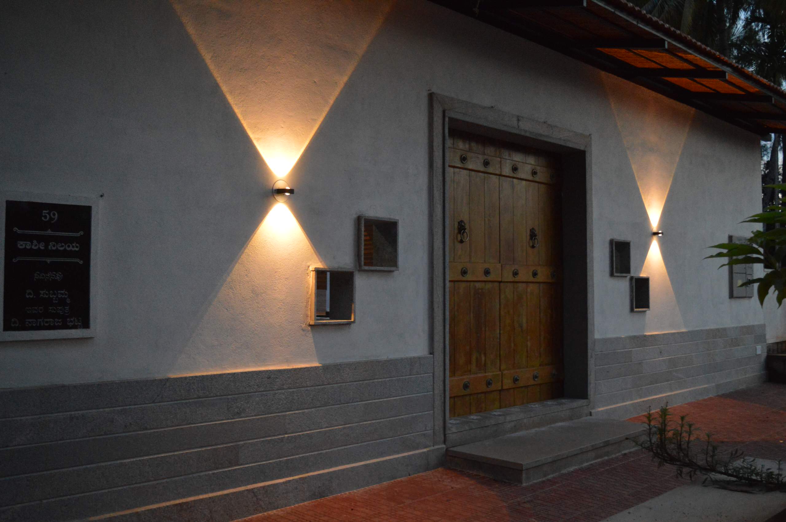5. Tiny wall lights throw powerful beams that shine upwards and downwards on this exterior wall. The illumination cast by the lights forms an intriguing hourglass pattern on either side of the castle-like door. The orange-tinted light and the wooden door add a touch of warmth to the matte grey wall.