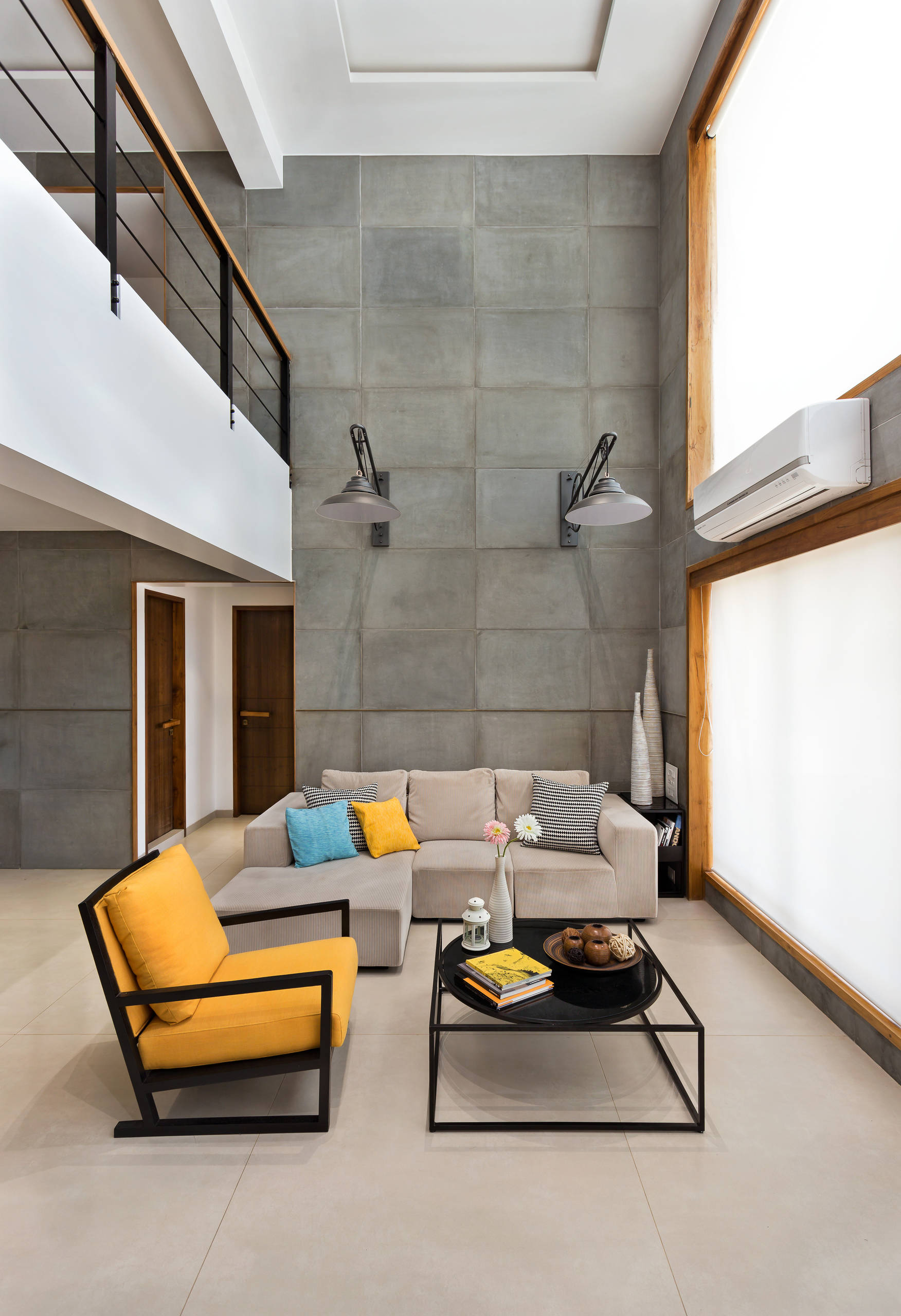 14. Industrial lamps come home in this living room. Two large shielded street-style lamps work well on the double-height exposed cement wall. The design of the lamps is in consonance with the straight-lined style of the furniture in the room.