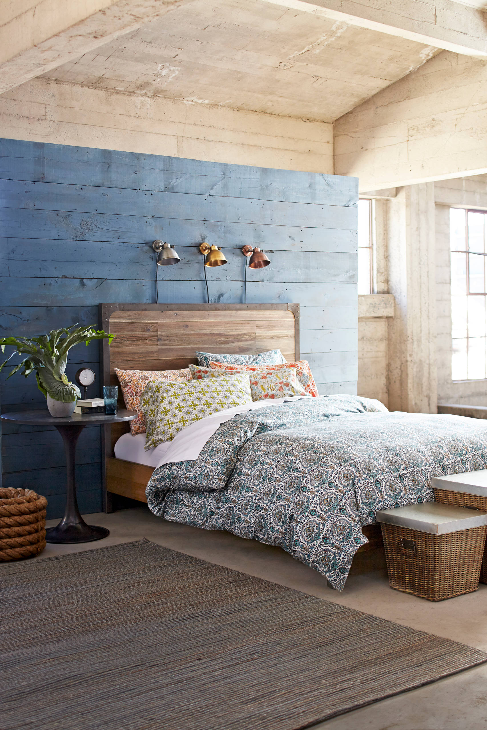 19. An innovative approach to bedside lighting, here three lamps cast focus light from above the headboard. What makes these lights of regular design unique is the way they are used in three different metal colours – steel, brass and copper. See how they offset the wall made of rugged blue-washed wooden planks.