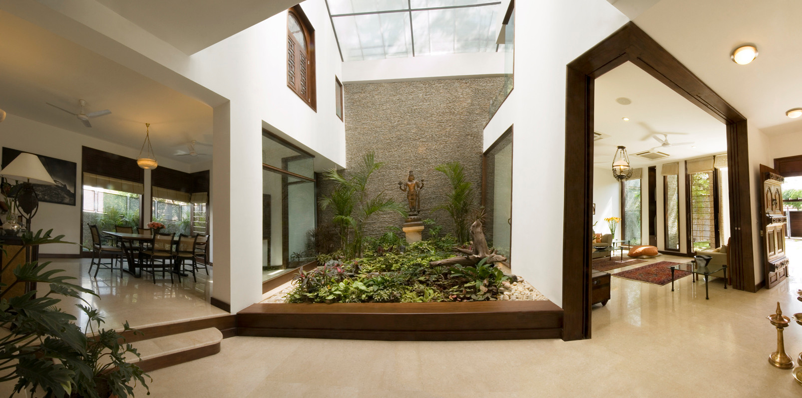 This atrium situated in the centre of the home where all rooms converge, features a miniature rock garden and the statue of a deity.