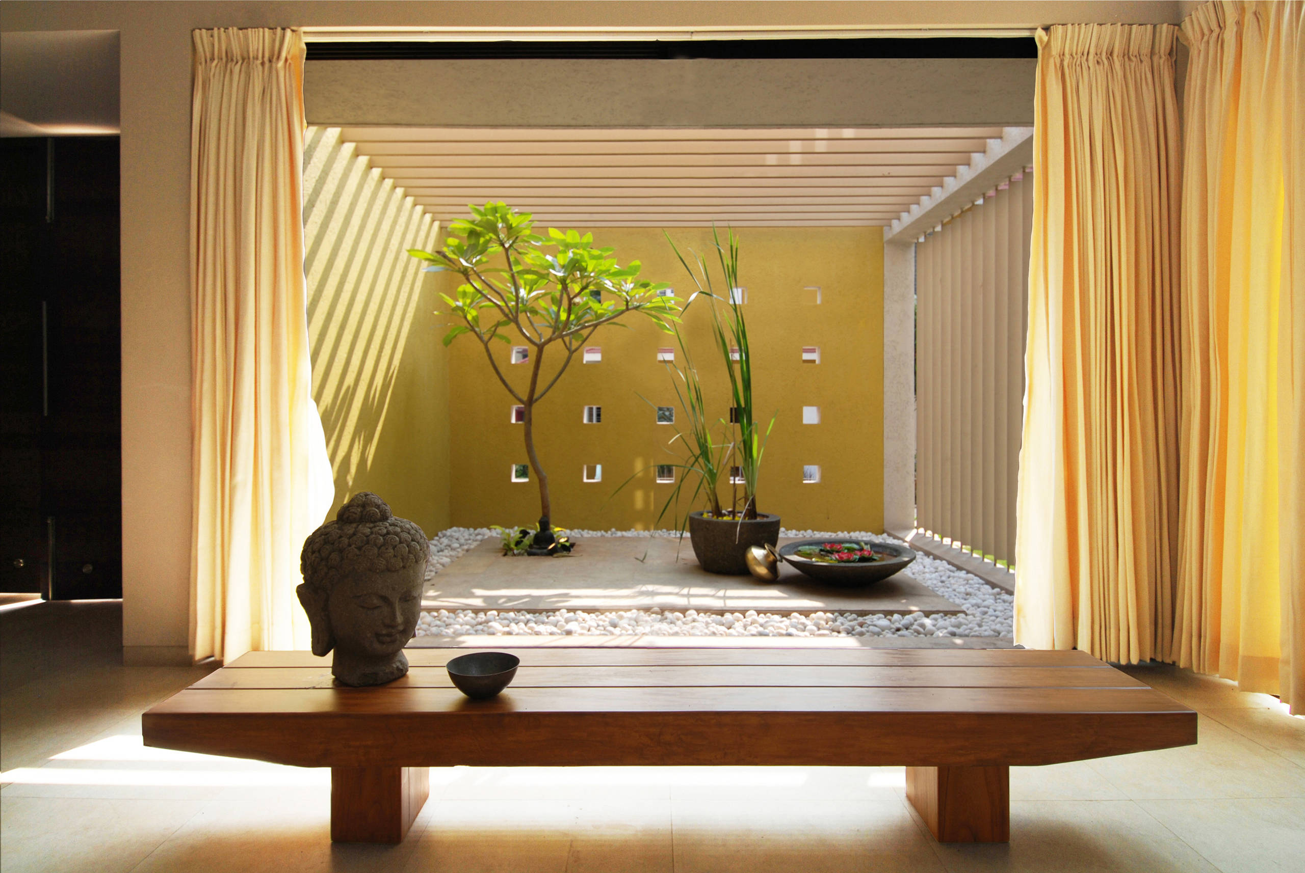 Here is a courtyard that radiates calm in a sunlit yellow setting. A louvered roof and wall facilitate circulation of air, while the plants and the tiny water body help to cool the place.