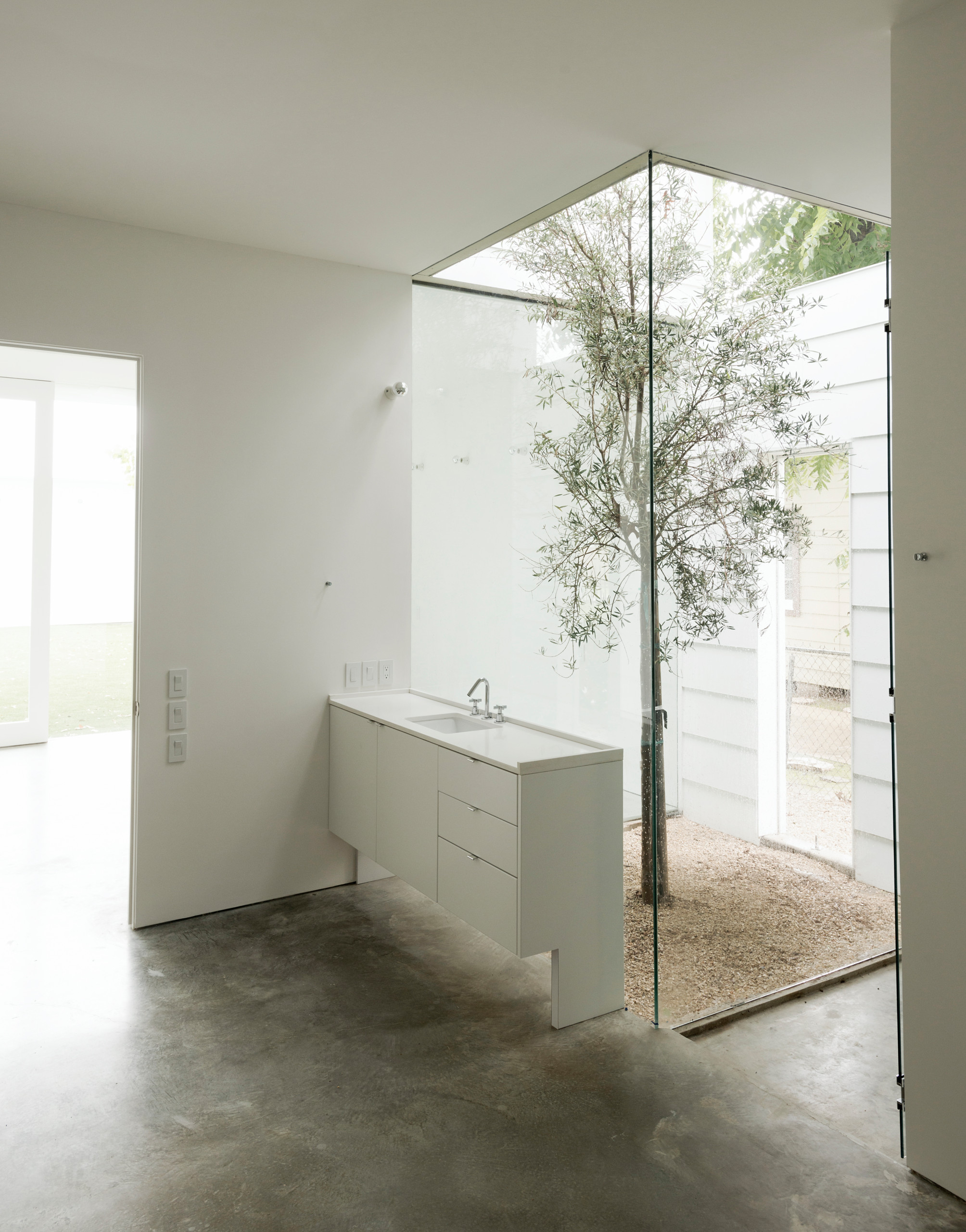 A stark bathroom gets a touch of the outdoors via a pebbled enclosure housing a lone tree. The feathery plant adds a touch of softness and colour to an all-white, minimalist space.