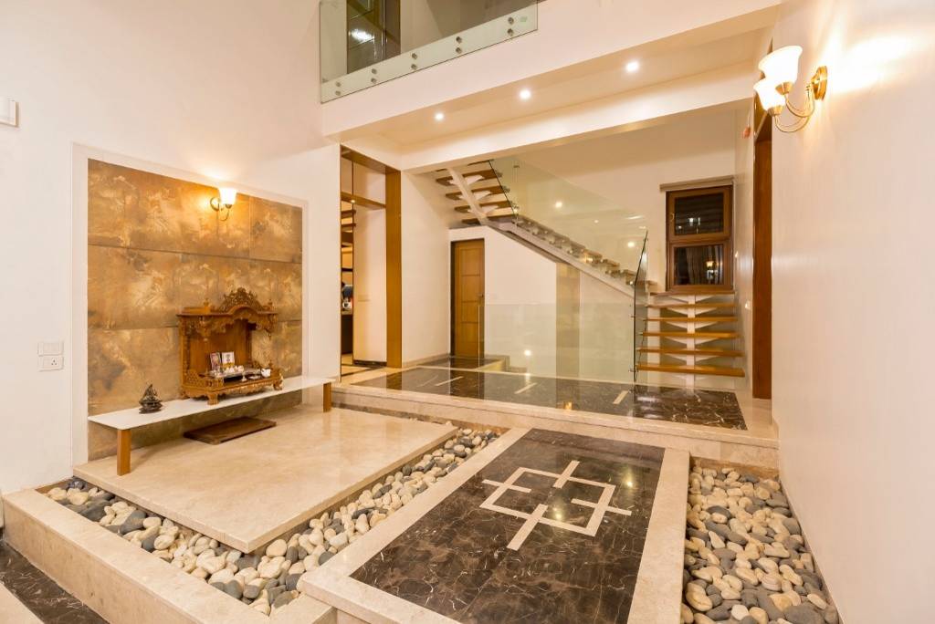A small pooja altar in a large atrium doubles as a prayer space as well as a decorative feature in this Pune home, thanks to patterned marble floors and pebbled borders.