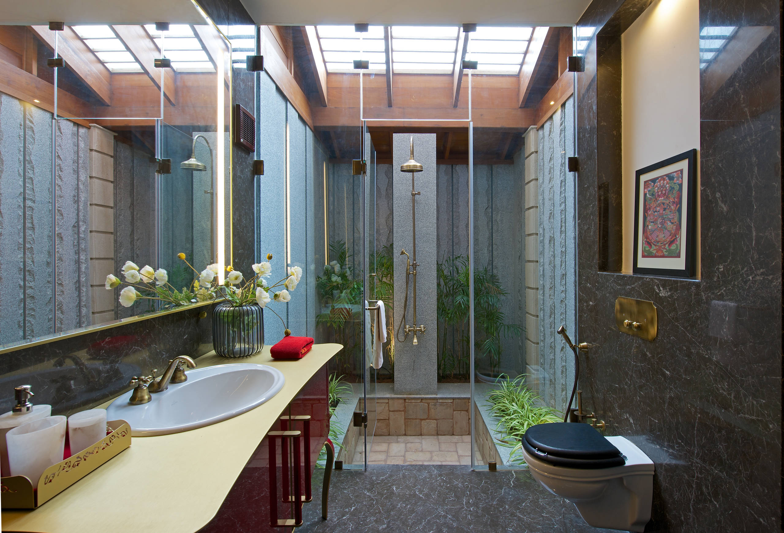 A bathroom envisaged as an atrium, features a glass roof and a sunken shower, surrounded by plants – all to make you feel like you are bathing in the outdoors.