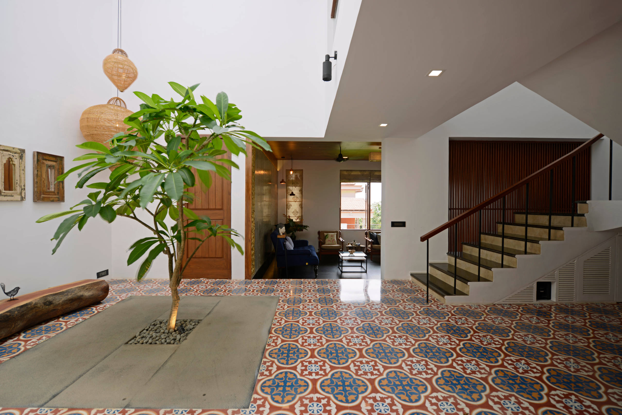 A modern-meets-rustic interpretation of the traditional courtyard, this space is stunning in its mix of brightly patterned cement tiles, a frangipani tree set in a granite bed, and a tree trunk that serves as a seat.