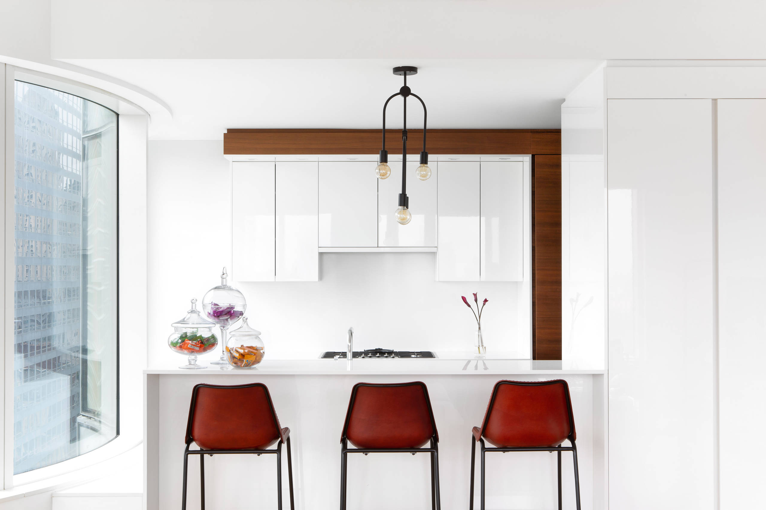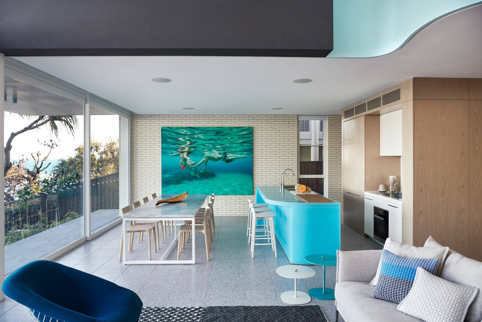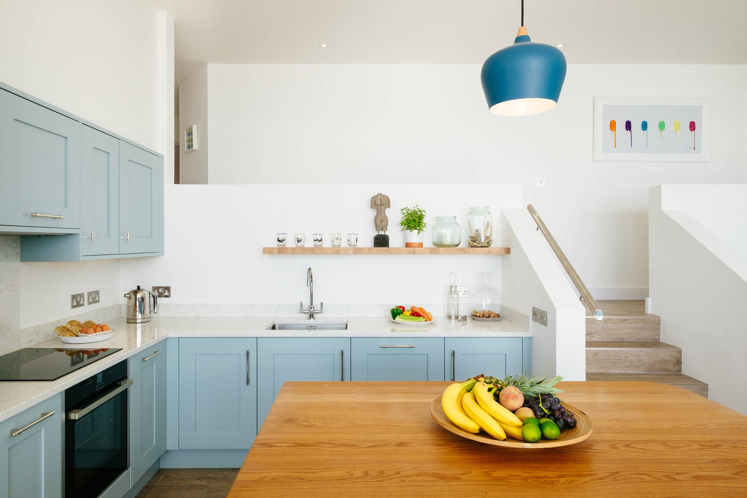Features: A touch of colour on white and timber.