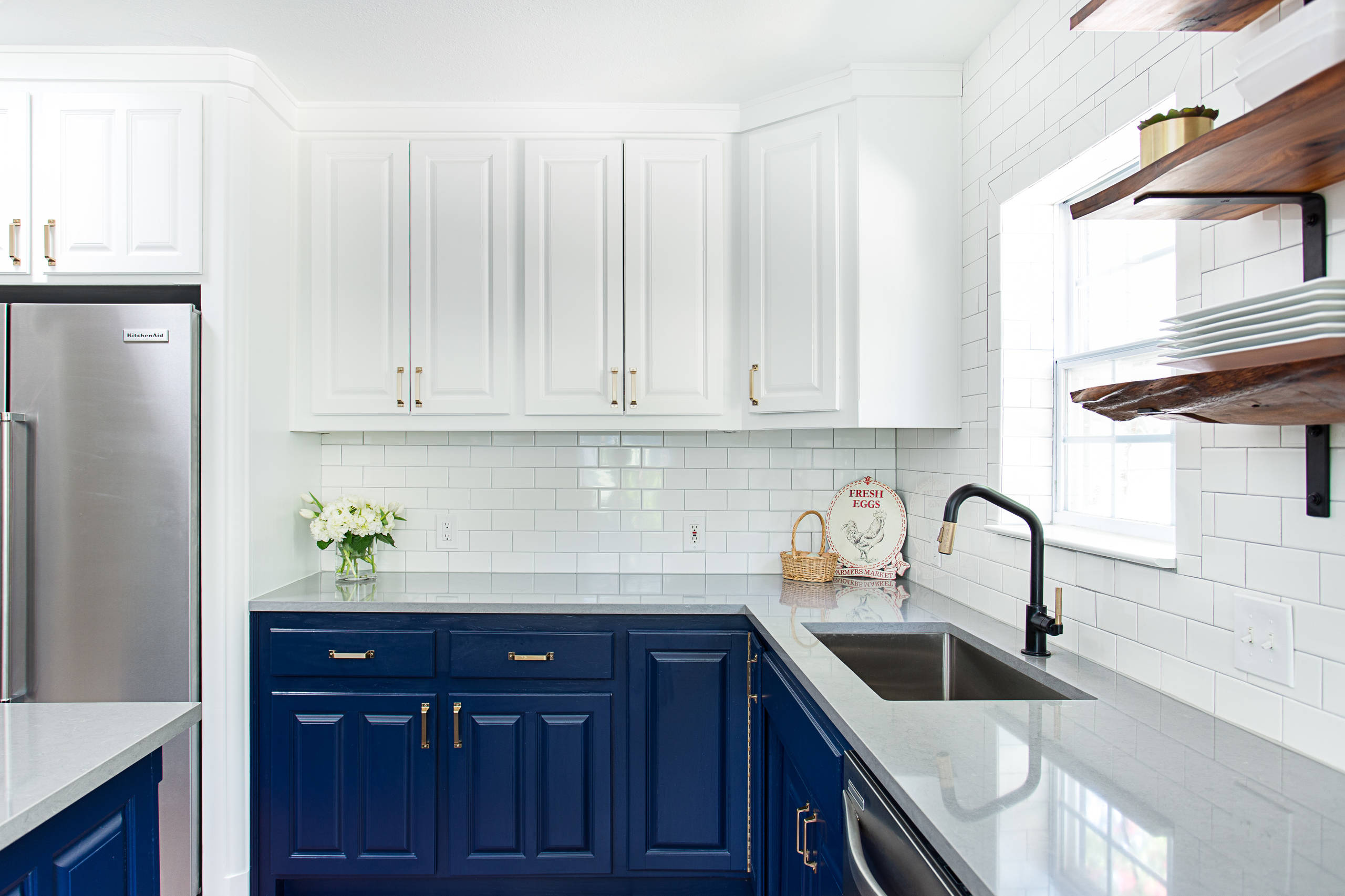 Features: Light below and dark above works well in this two-toned kitchen.