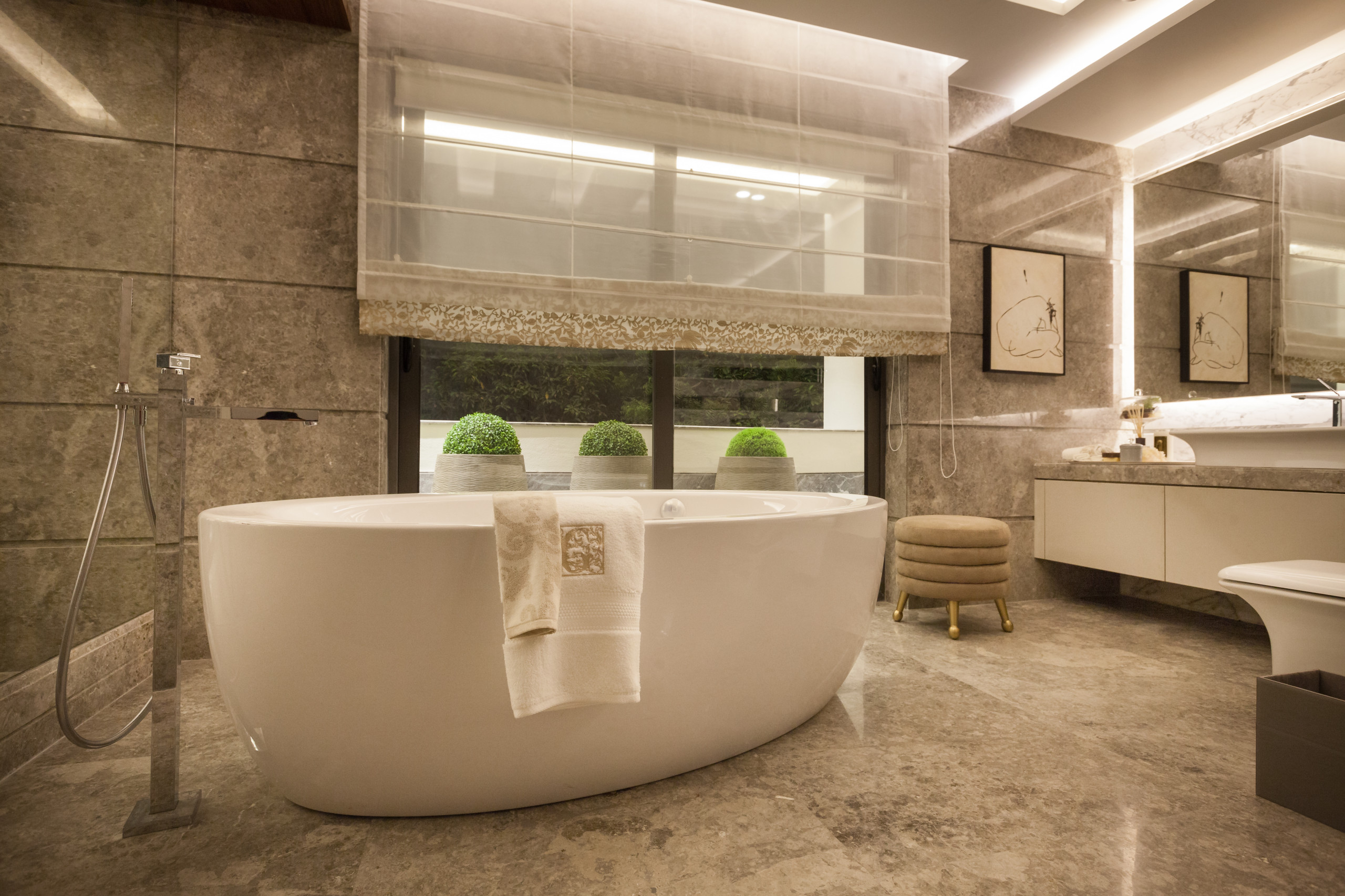 Install smart storage options (built-in cupboards, open vertical cabinets) to make the bathroom less cluttered. Remember, the less things you keep outside on display, the more chic your space will look. Install a green plant to add a tropical feel. A chandelier can definitely make a statement here.