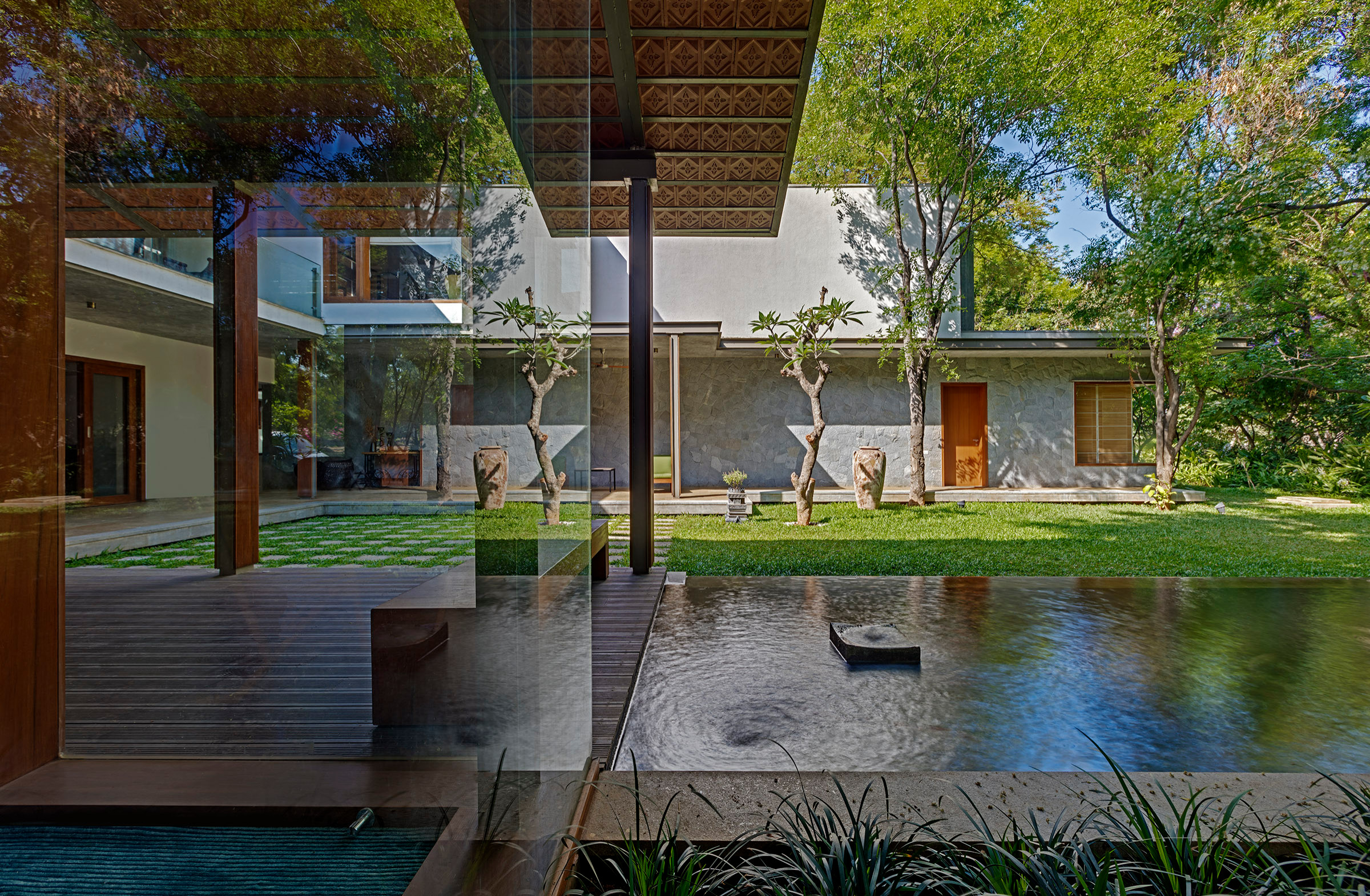 The entrance to the house through a courtyard (one of many in the house) encloses a neem tree (Azadirachta indica), which has great significance in Indian households. Traditional jaalis used in the external facade have been given a contemporary twist by executing them with a modern material – Corten steel. There are also huge cantilevers that create spectacular verandahs reminiscent of traditional Indian homes.