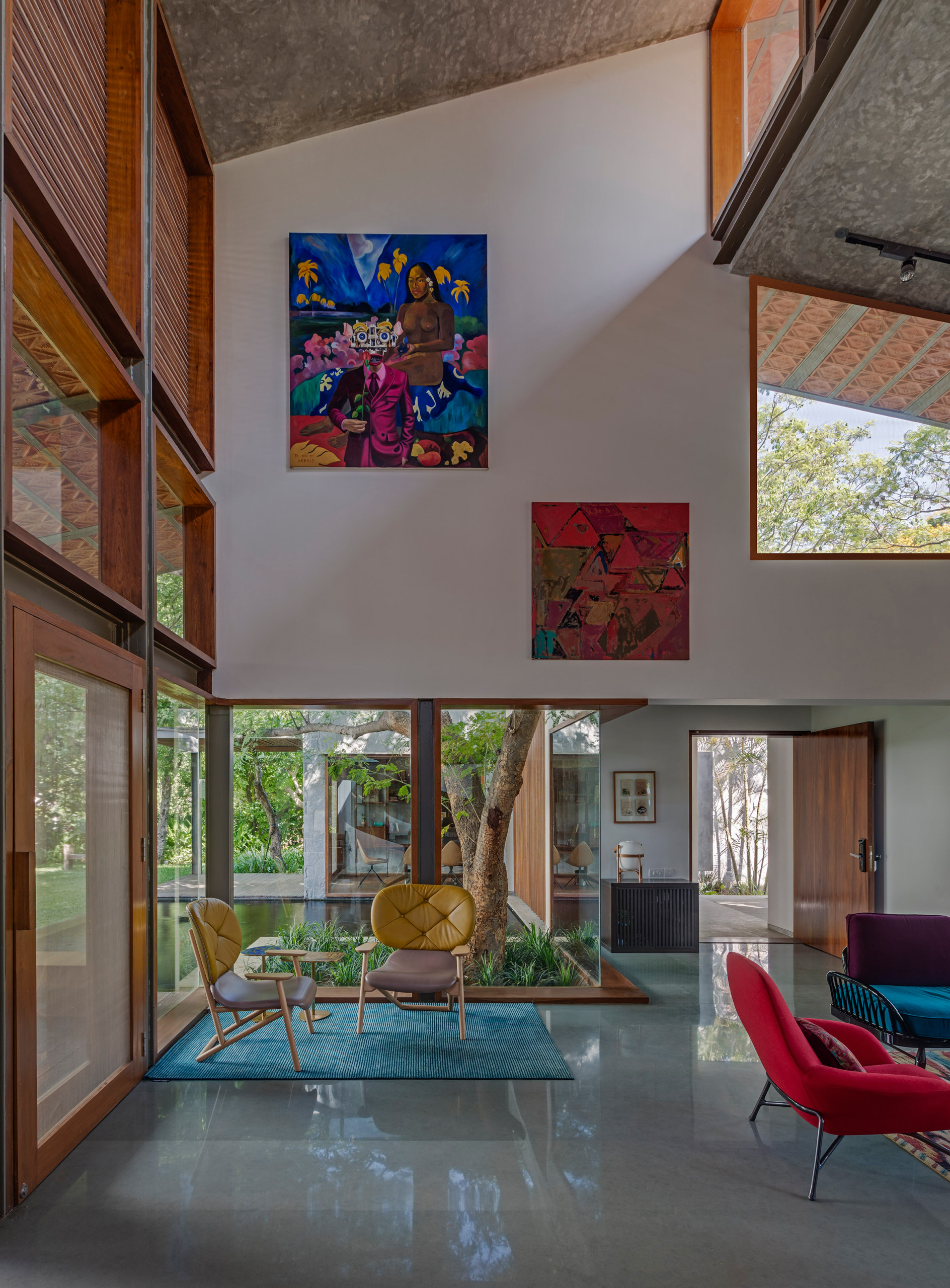 The architecture seamlessly combines the double-height spaces with the pitched Mangalore-tiled roof. The house maintains a vibrant, organic connect with its natural surroundings through a landscaped garden with a water body in its central courtyard (very traditional), while using contemporary styled furniture throughout its interiors.