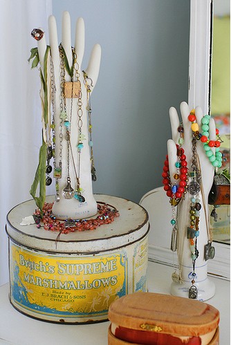 You can make stands or holders for your pendants and bracelets. You can even use your gardening gloves as a mould for shaping these hand-hangers, as in this image.