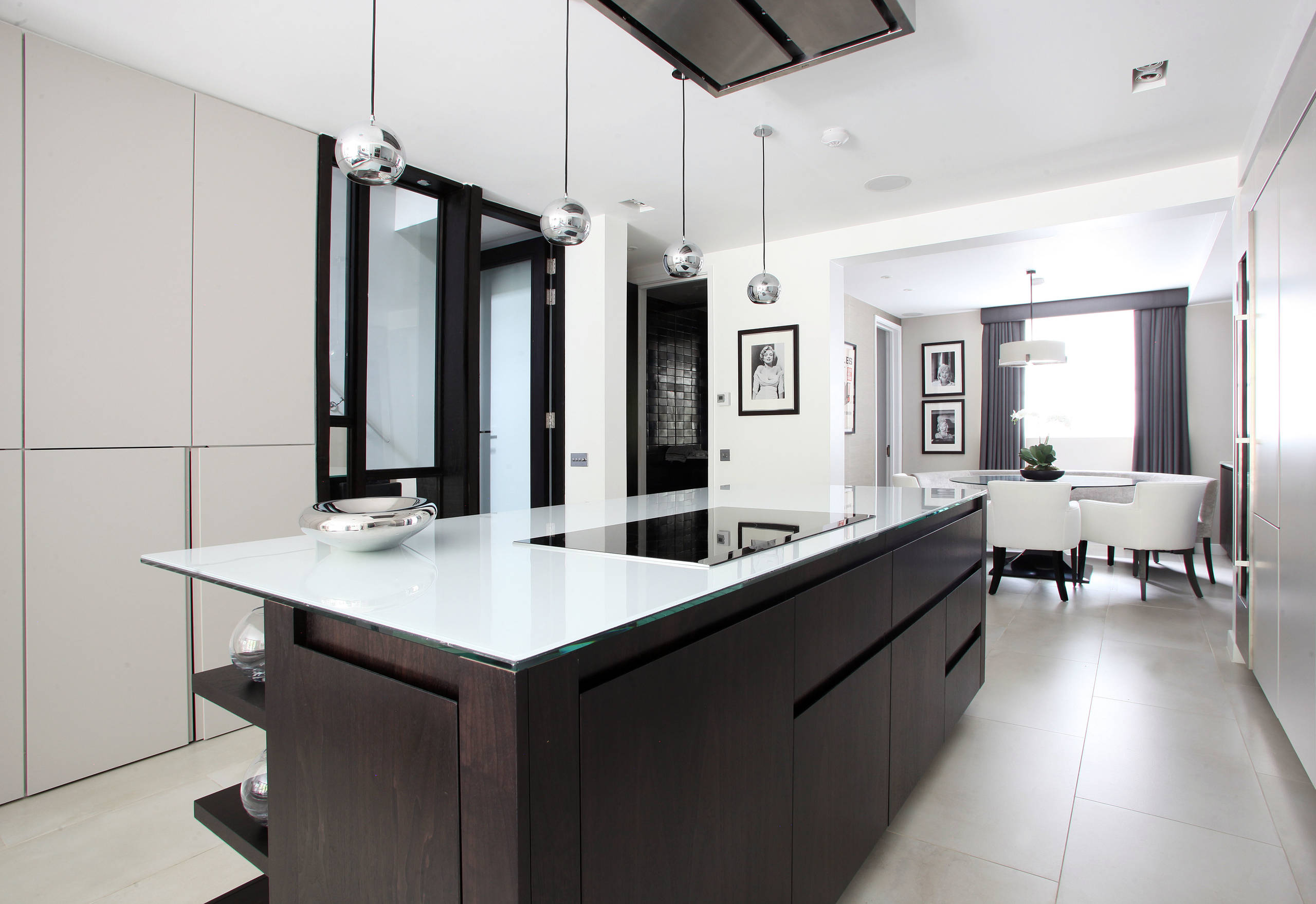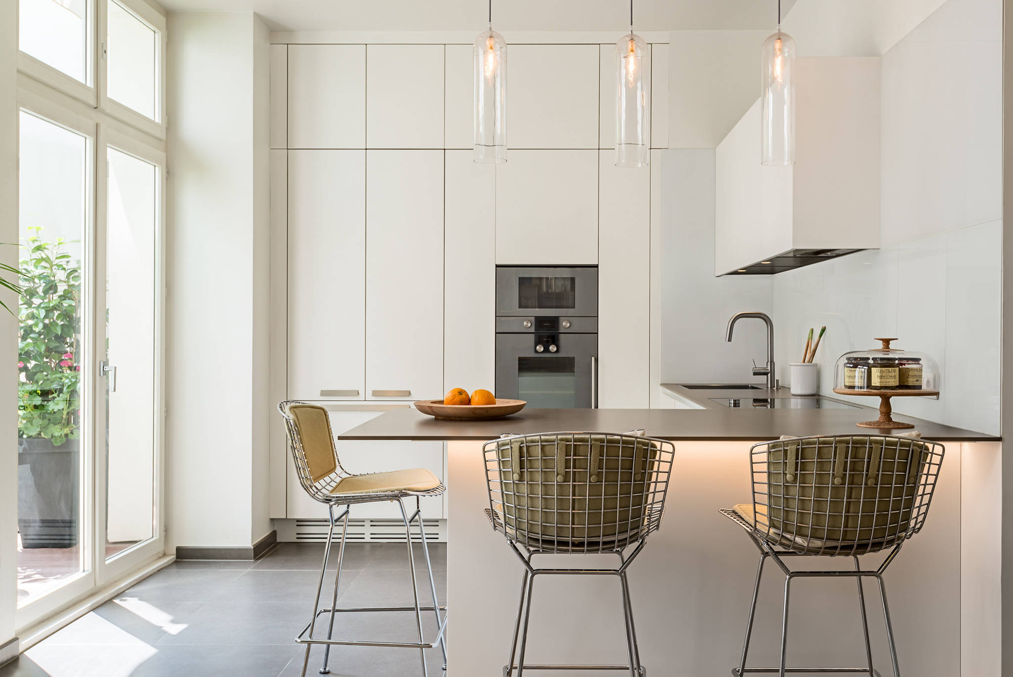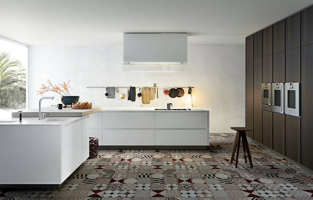 Tip: If straight, clean lines are too sterile for you, add visual interest by way of a splash of colour or a pattern. The even lines and plain colours of this slick kitchen stand out against the tiled floor, which brings an arty edge to the space. This is reflected in the line of utensils that hang on the far wall.