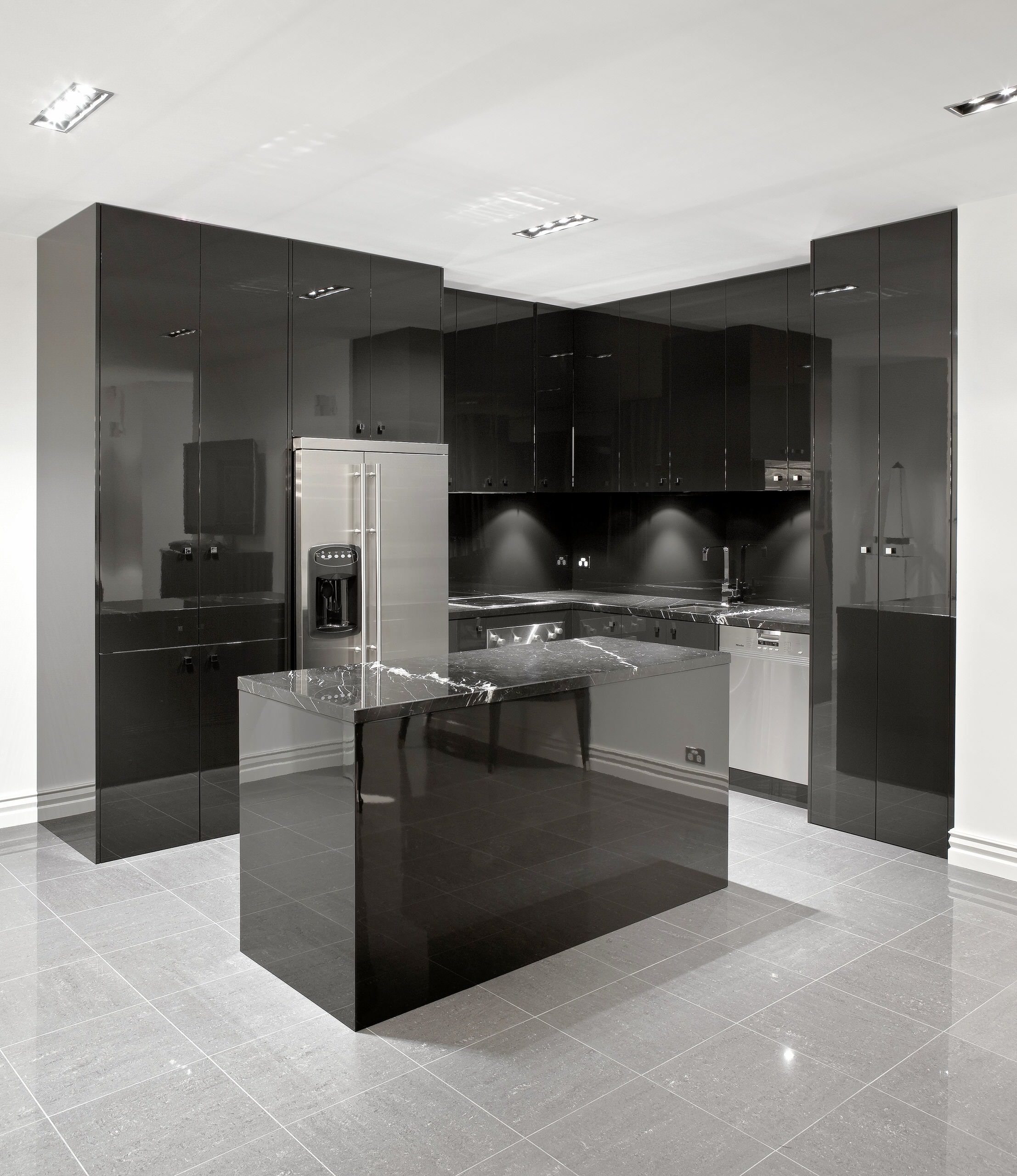 Here, the glossy black bottom cabinets are in sharp contrast to the white counter and overhead cabinets in this kitchen. The matte wood-brown and grey on the wall bridge the contrast gap.