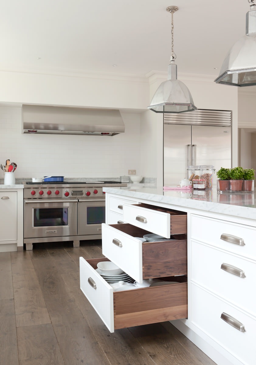 Storage is a perennial necessity in any kitchen. Drawers can help a kitchen feel less cramped and more spacious. They’re more accessible than typical base cabinetry and simple to integrate into a kitchen design. Deep drawers can be used to store items such as large pots and pans, reducing the need for wall cabinets; just make sure you measure first.
