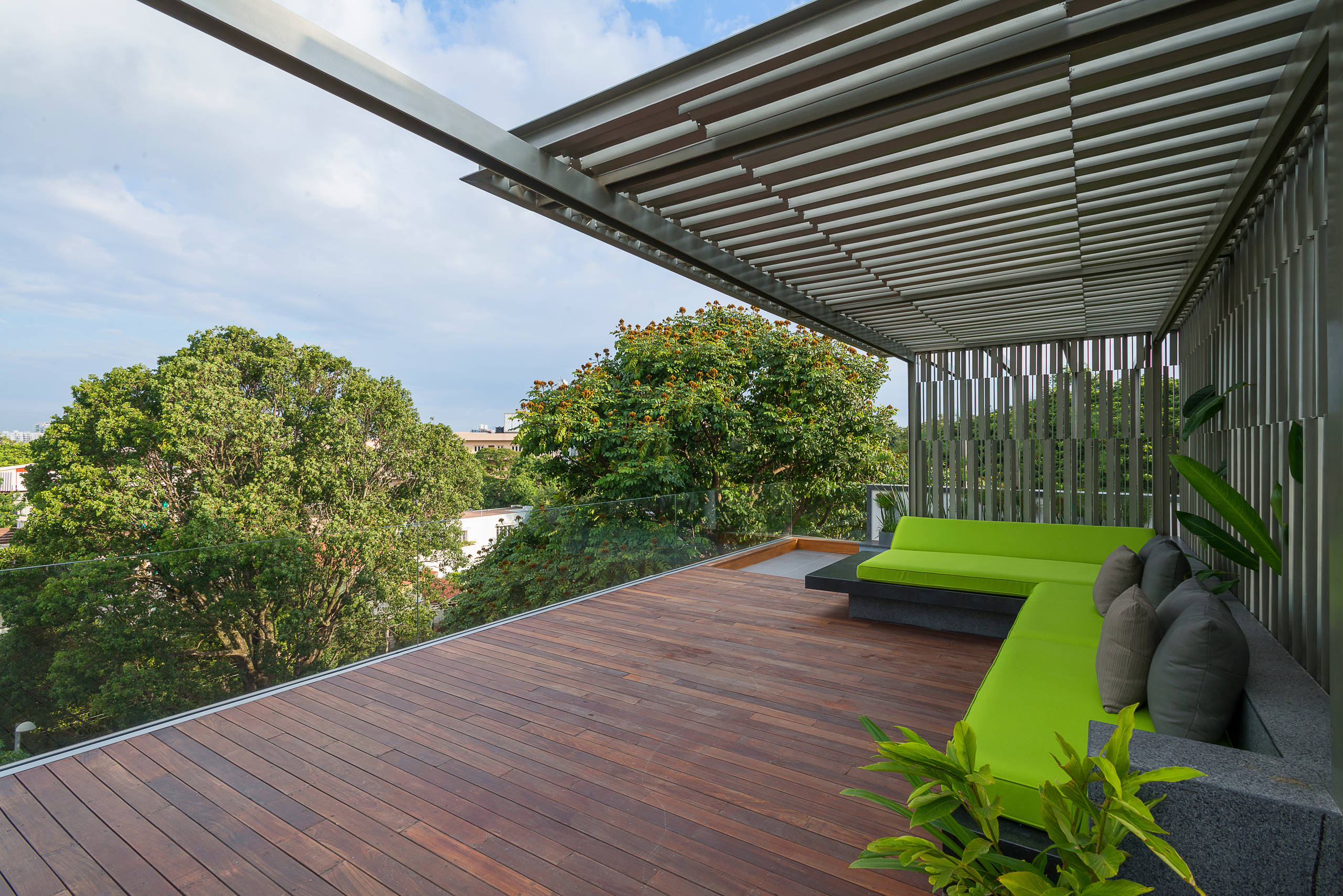 Here is a modern take on the pergola, where a steel lattice structure is incorporated to partly cover a section of the balcony. The metal lattice controls the intensity of the sun and creates a shaded seating area.