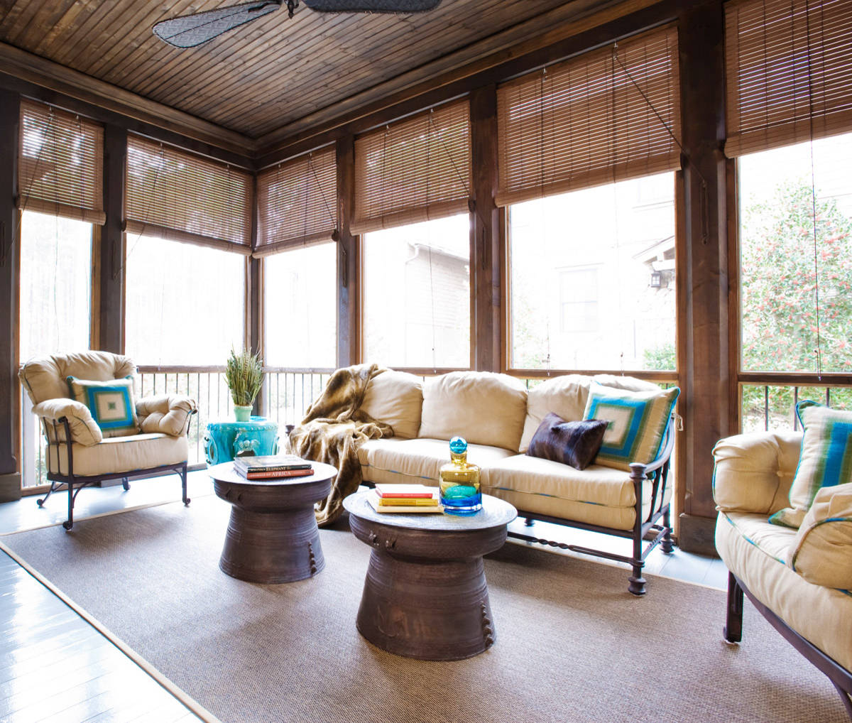 Since the sun changes its angle throughout the day, only overhead protection from the sun is not enough, because heat can penetrate from the sides of the balcony. In this image, the roller shades create a comfortable indoor-outdoor seating space and also provides privacy from the neighbours. Roller shades are available in materials like wood , bamboo, PVC or jute, which are sturdy and long-lasting.