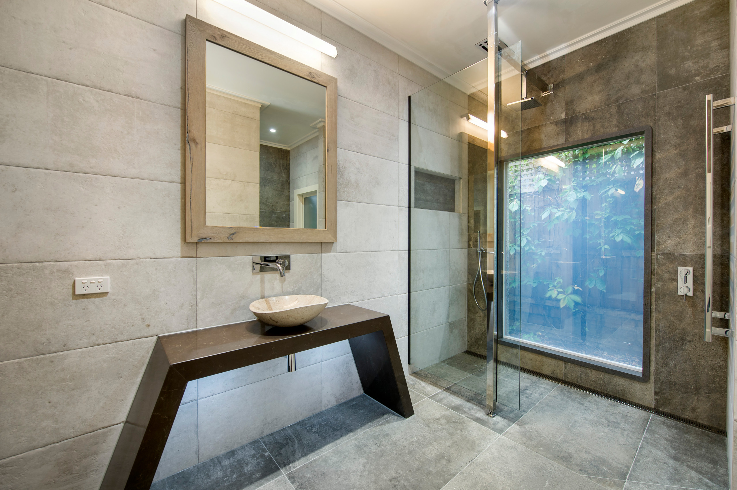 Textured glass can contribute to the character of heritage homes, as it does in this updated Edwardian villa. The bathroom is adjacent to the study, and the textured glass in the lower pane of the existing windows provides privacy, while the upper pane allows light to filter through.